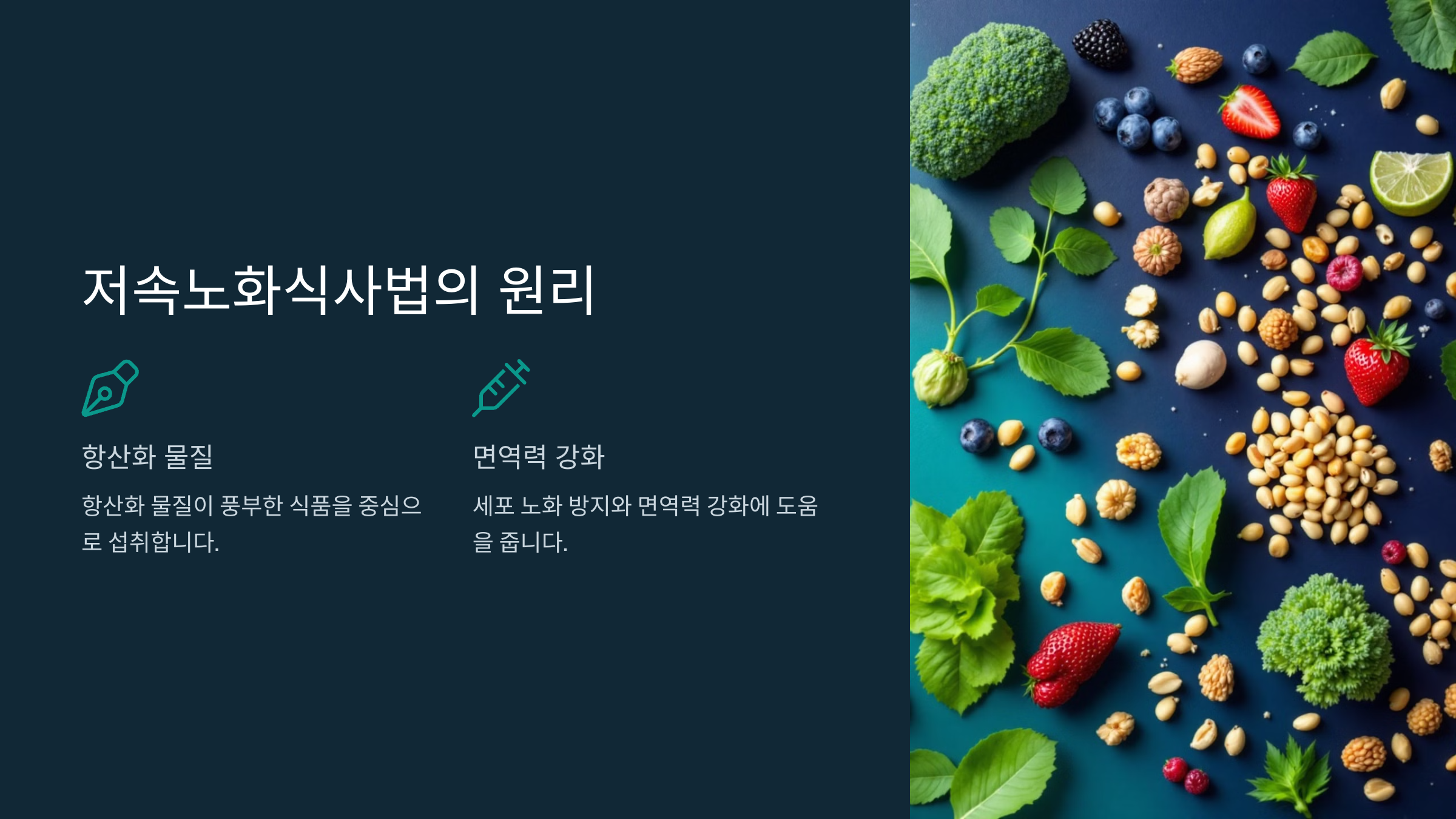 저속노화는 단순히 노화의 속도를 늦추는 것이 아닙니다. 이는 건강한 세포의 유지와 재생을 통해 신체의 기능을 최적화하는 것을 의미합니다. 마치 오래된 나무가 튼튼한 뿌리를 내리고 자라는 것처럼, 우리의 몸도 건강한 식사를 통해 젊음을 유지할 수 있습니다.