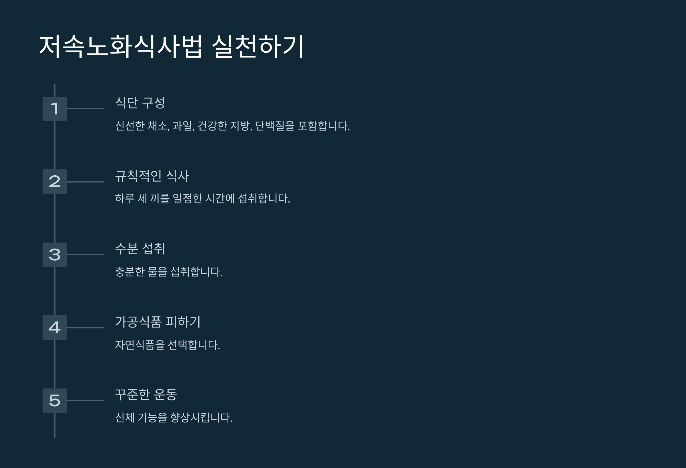 저속노화식사법을 실천하기 위해서는 먼저 식단을 구성해야 합니다. 신선한 채소와 과일, 건강한 지방, 그리고 단백질이 풍부한 식품을 포함하는 것이 중요합니다.