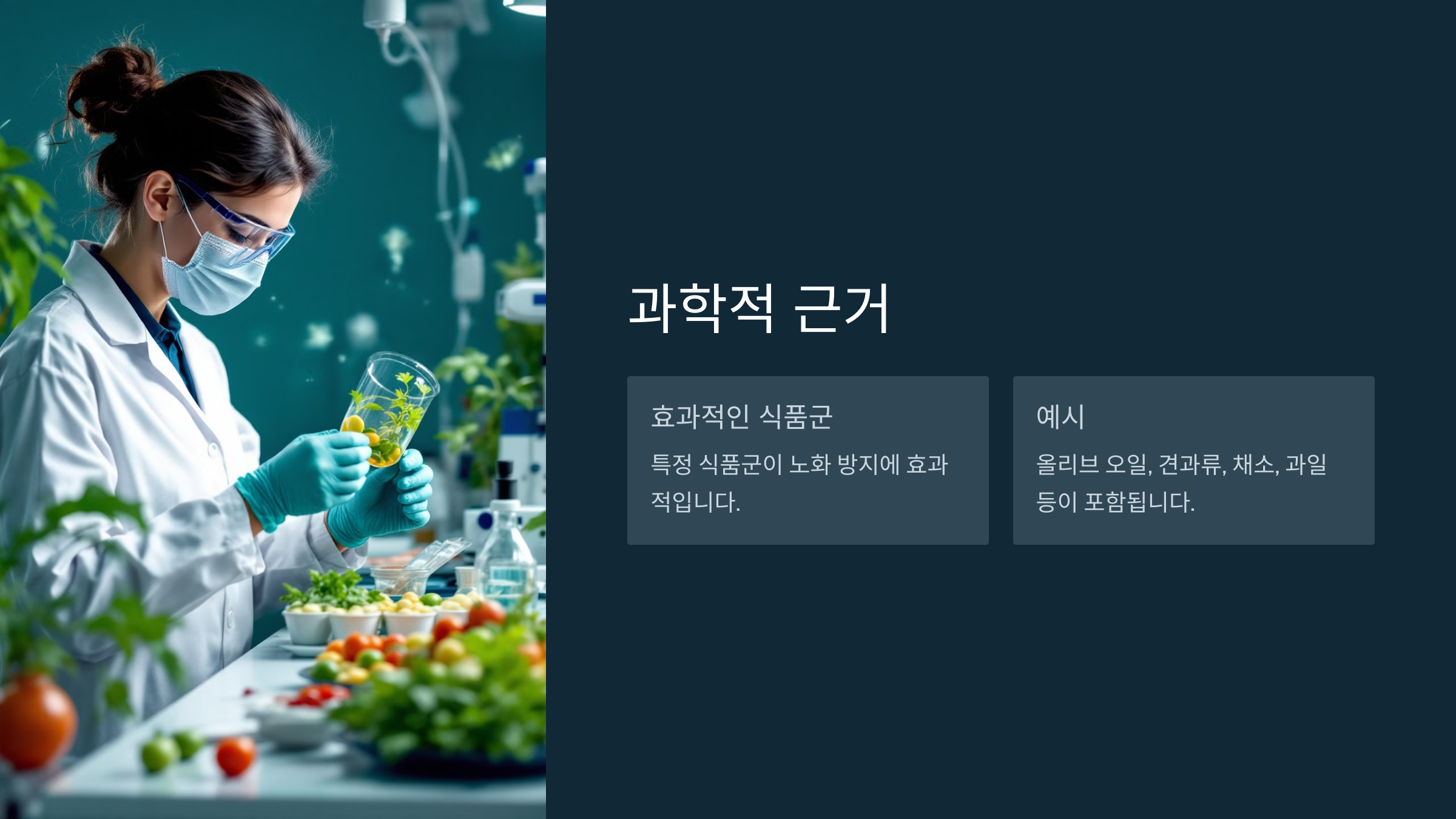 최근 연구에 따르면, 특정 식품군이 노화 방지에 효과적이라는 결과가 다수 발표되었습니다. 예를 들어, 올리브 오일, 견과류, 그리고 다양한 채소와 과일이 그 예입니다. 이러한 식품들은 우리 몸의 염증을 줄이고, 세포의 건강을 유지하는 데 기여합니다.