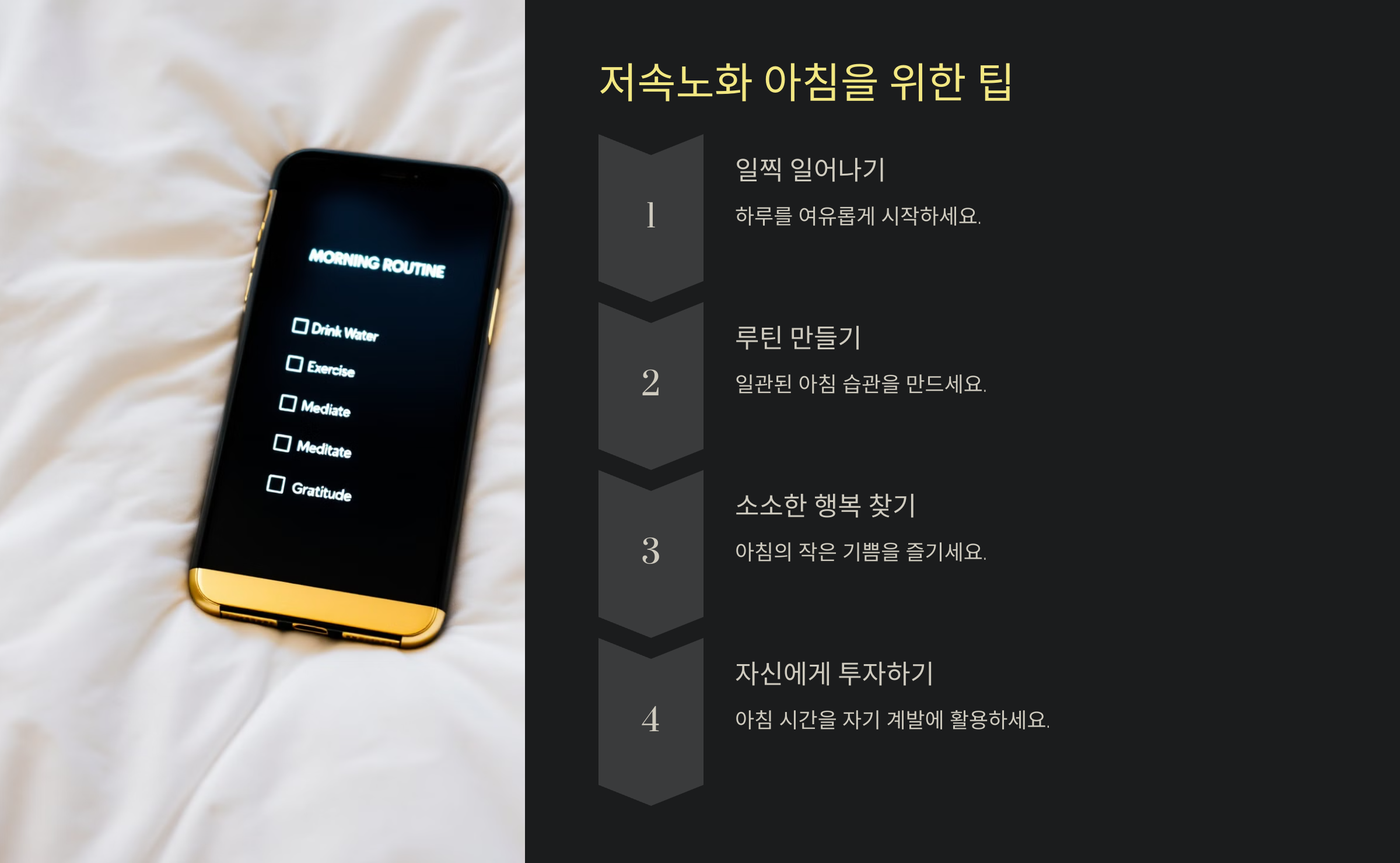아침 시간을 자신에게 투자하는 것이 중요합니다. 이는 저속노화에 기여합니다.