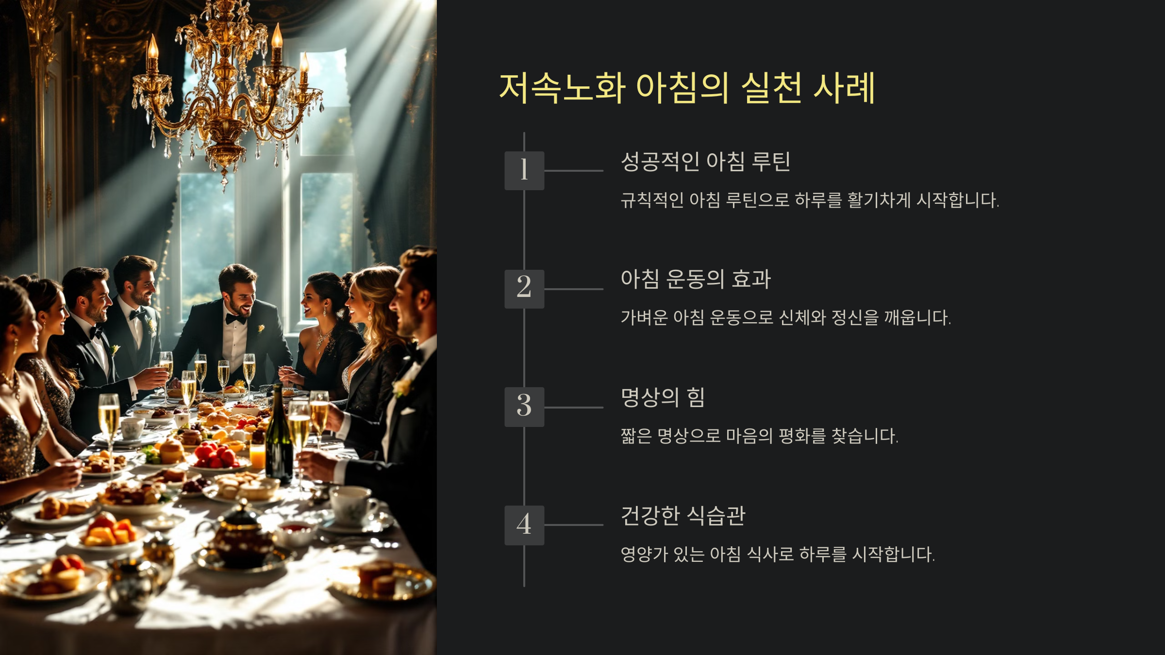 많은 성공한 사람들은 아침에 일찍 일어나 자신만의 루틴을 가지고 있습니다. 이는 저속노화에 긍정적인 영향을 미칩니다.