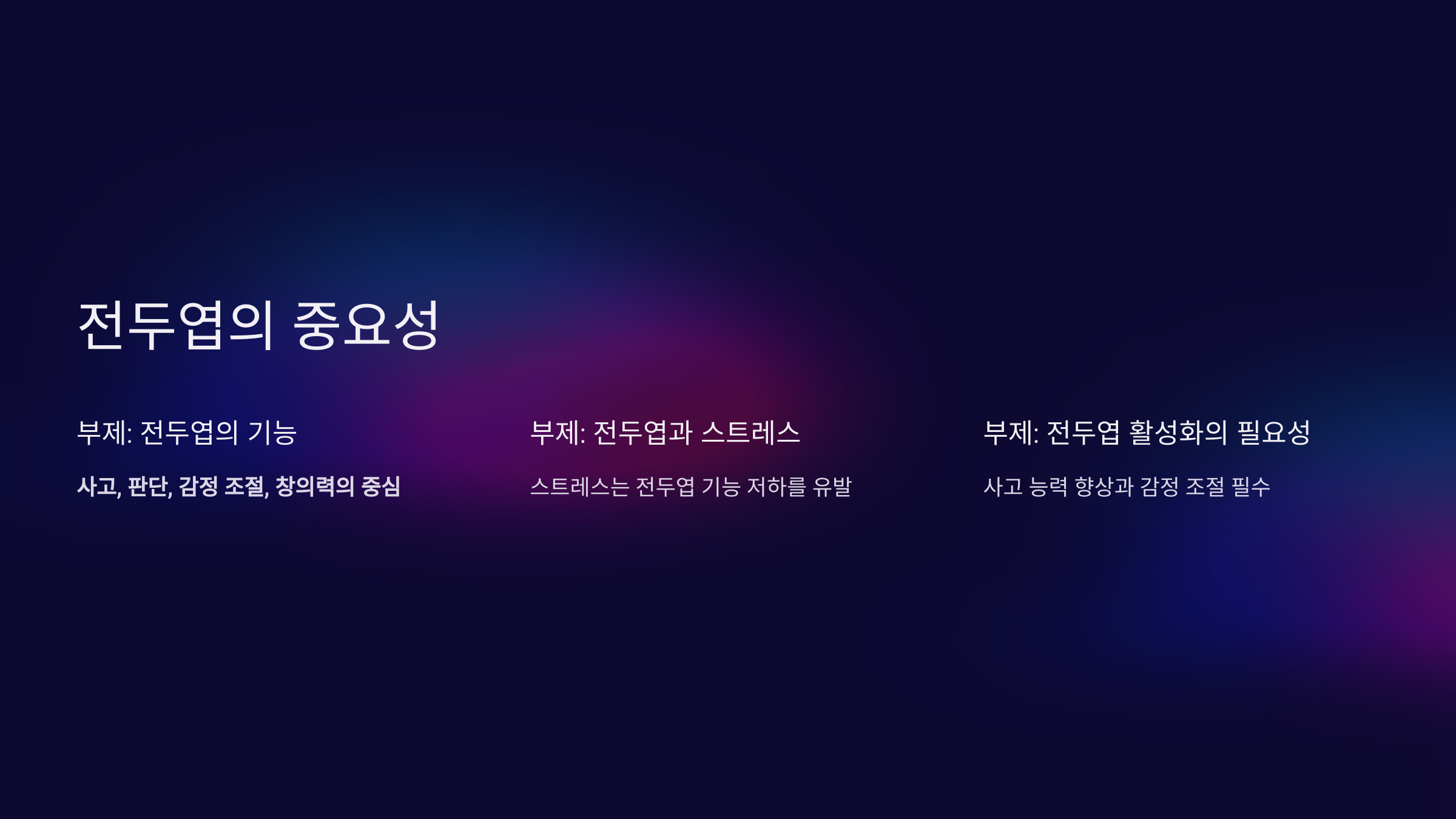 현대인의 삶은 스트레스로 가득 차 있습니다. 이러한 스트레스는 전두엽의 기능을 저하시킬 수 있습니다. 예를 들어, 과도한 업무나 개인적인 문제는 우리의 집중력을 떨어뜨리고, 감정 조절을 어렵게 만듭니다. 따라서 전두엽을 활성화하는 것이 중요합니다.
