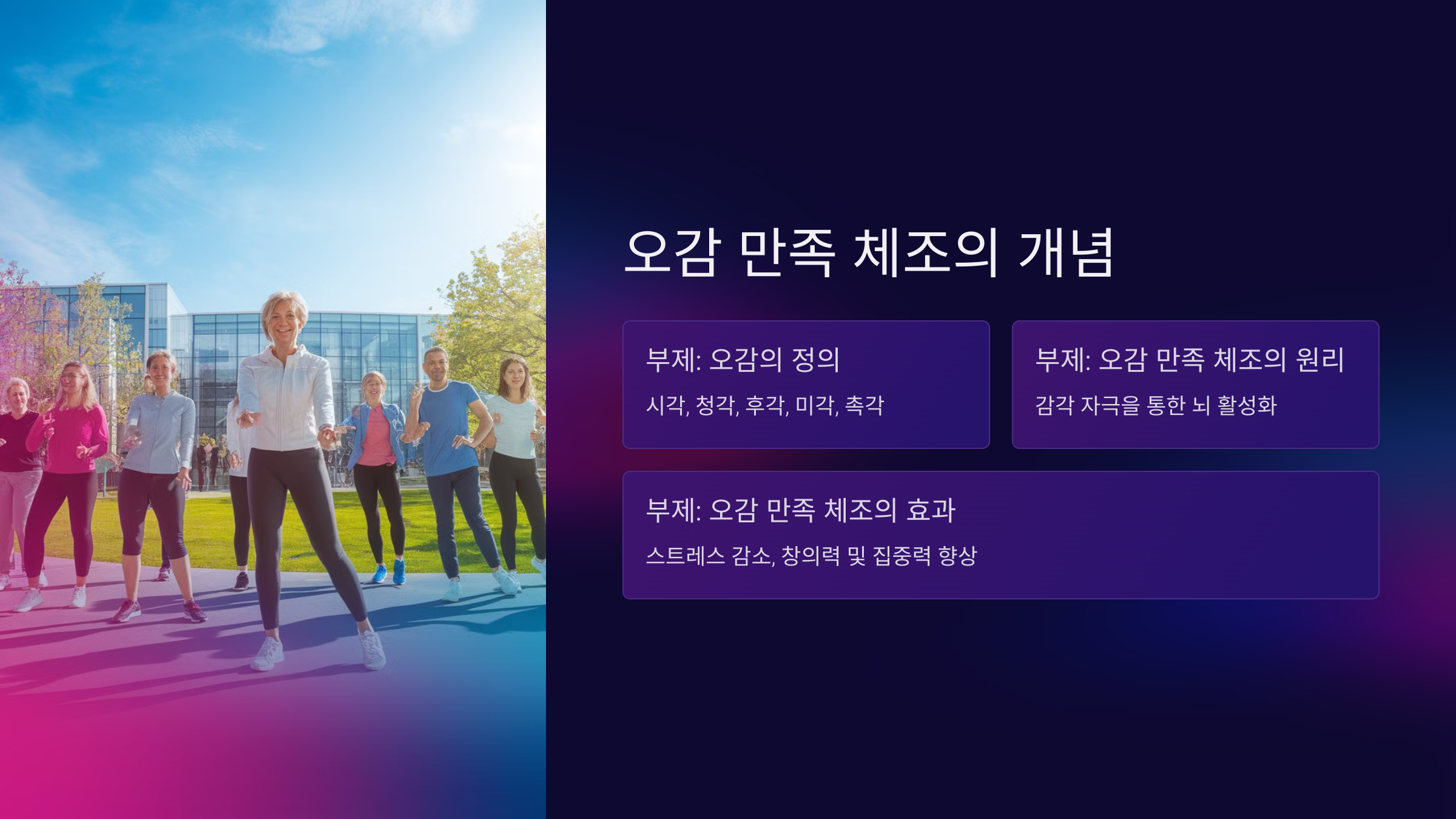 - 운동법 소개: 오감 만족 체조는 시선, 청각, 운동 신경을 모두 활용하는 동작으로 구성되어 있습니다.
