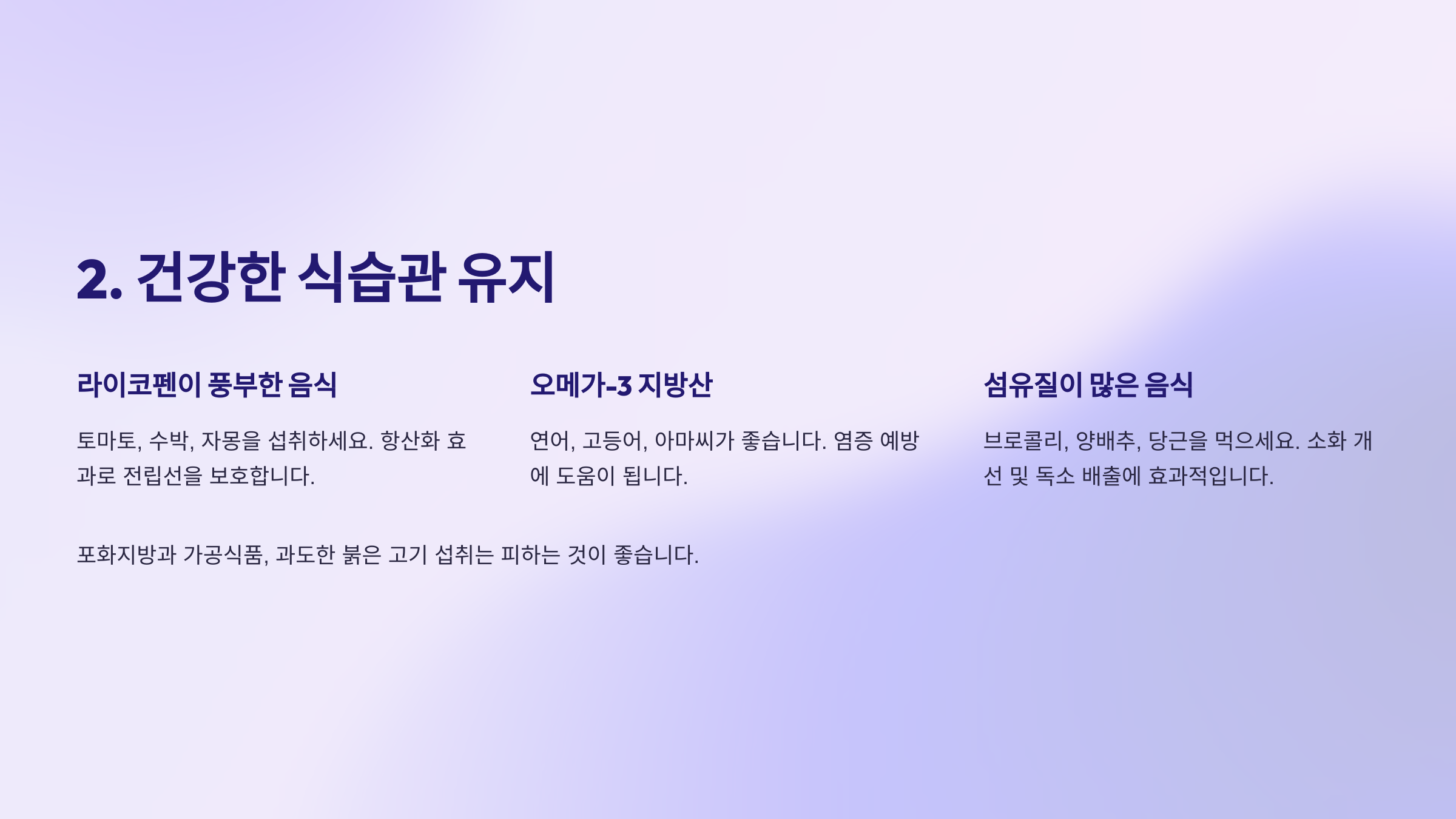 반면, 포화지방과 가공식품, 과도한 붉은 고기 섭취는 피하는 것이 좋습니다.
