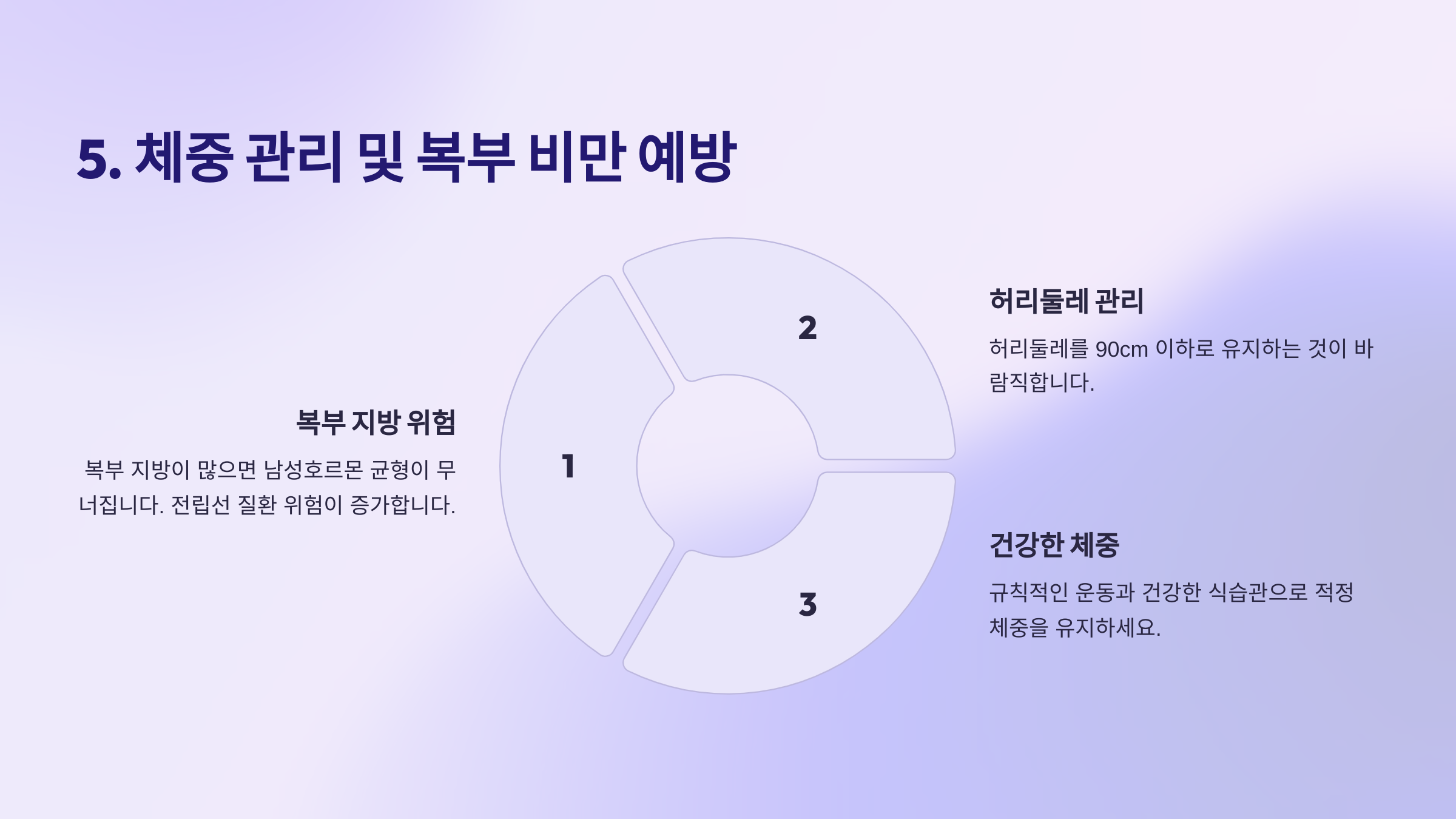 - 복부 지방이 많으면 남성호르몬 균형이 무너져 전립선 질환 위험이 증가합니다.