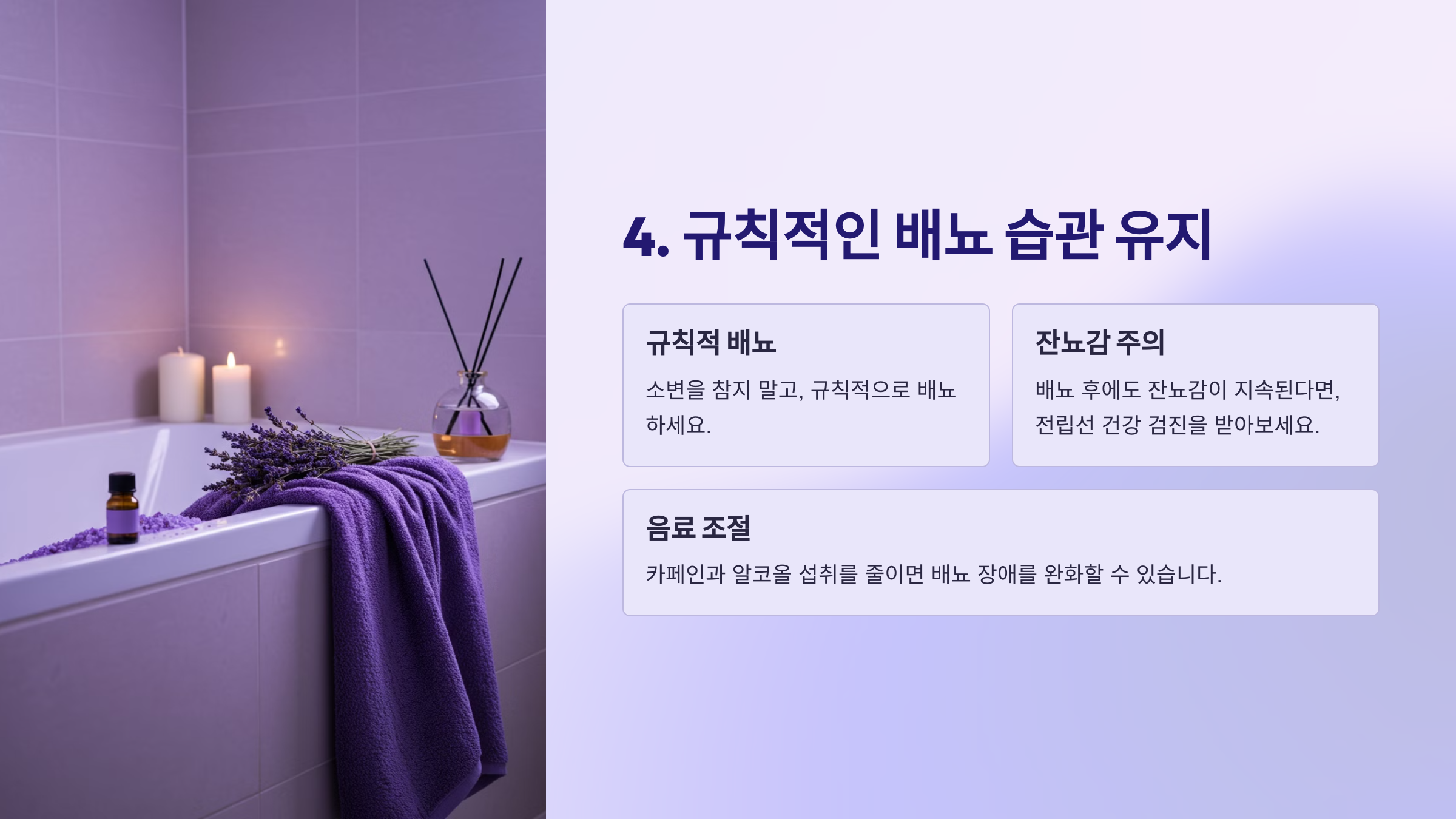 - 배뇨 후에도 잔뇨감이 지속된다면, 전립선 건강 검진을 받아보는 것이 좋습니다.