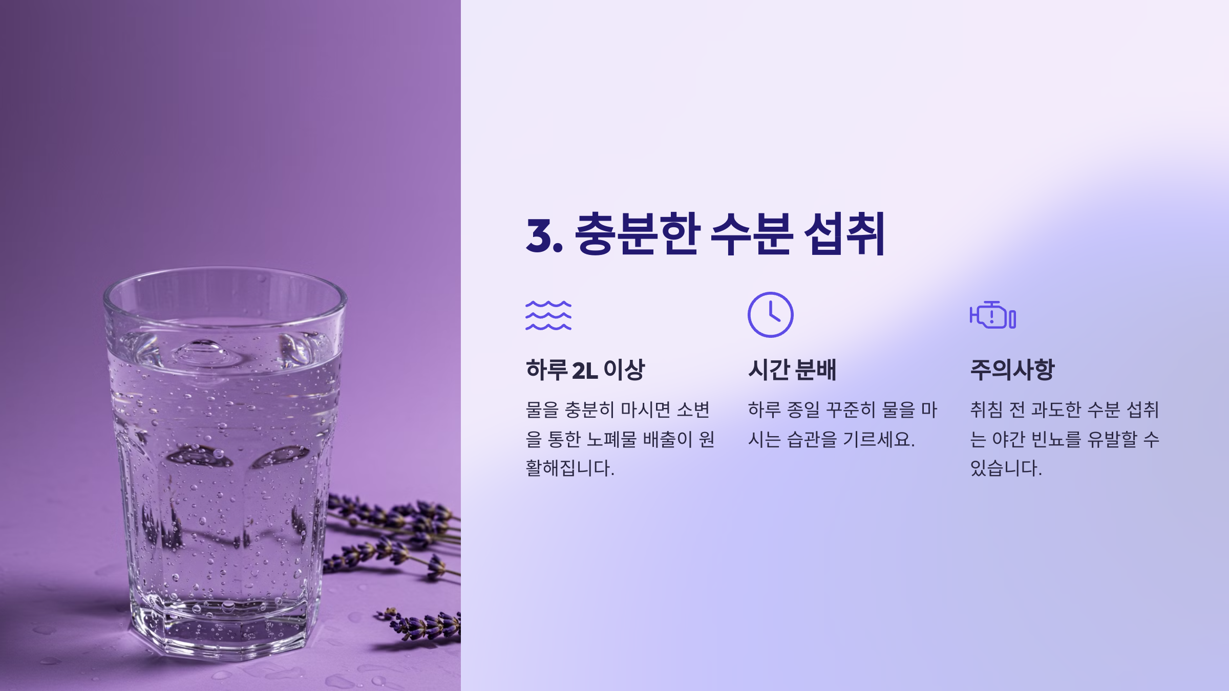 - 하지만 취침 전 과도한 수분 섭취는 야간 빈뇨를 유발할 수 있으므로 주의하세요.