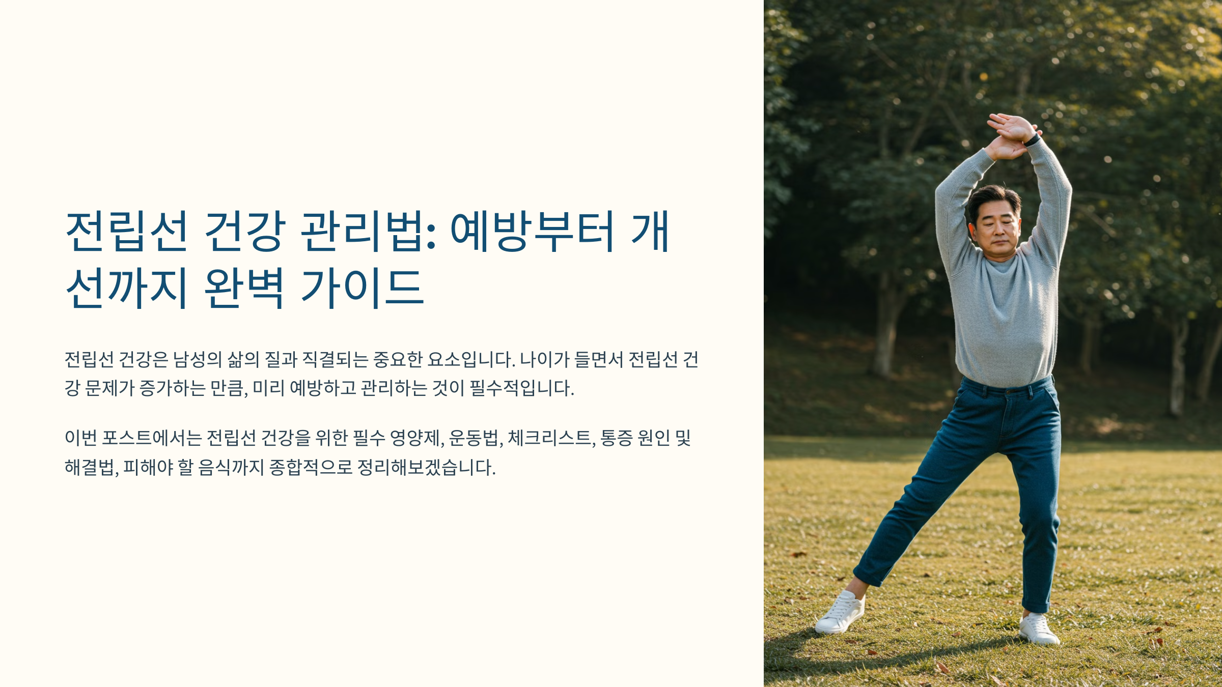 전립선 건강은 남성의 삶의 질과 직결되는 중요한 요소입니다. 나이가 들면서 전립선 건강 문제가 증가하는 만큼, 미리 예방하고 관리하는 것이 필수적입니다. 이번 포스트에서는 전립선 건강을 위한 필수 영양제, 운동법, 체크리스트, 통증 원인 및 해결법, 피해야 할 음식까지 종합적으로 정리해 보겠습니다.