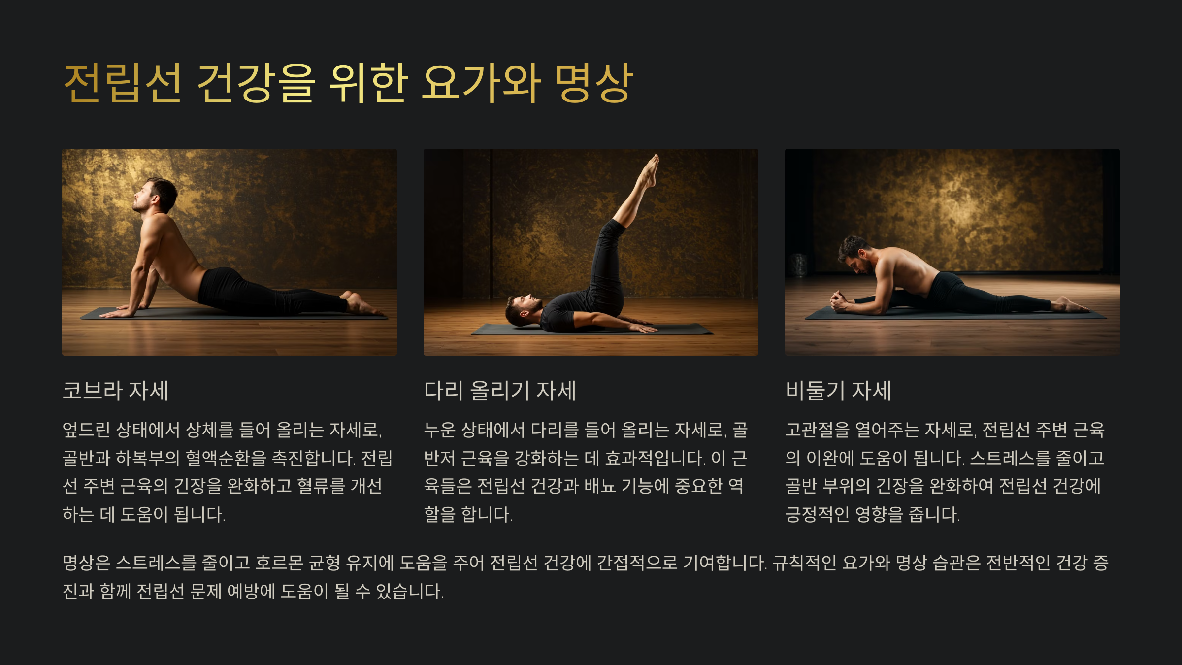- 규칙적인 운동: 골반저 근육 운동(Kegel 운동)이 전립선 건강에 도움
