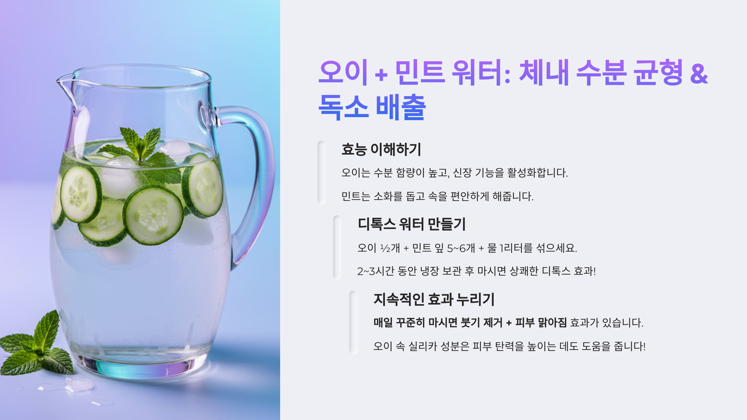 🥒 3. 오이 + 민트 워터: 체내 수분 균형 & 독소 배출