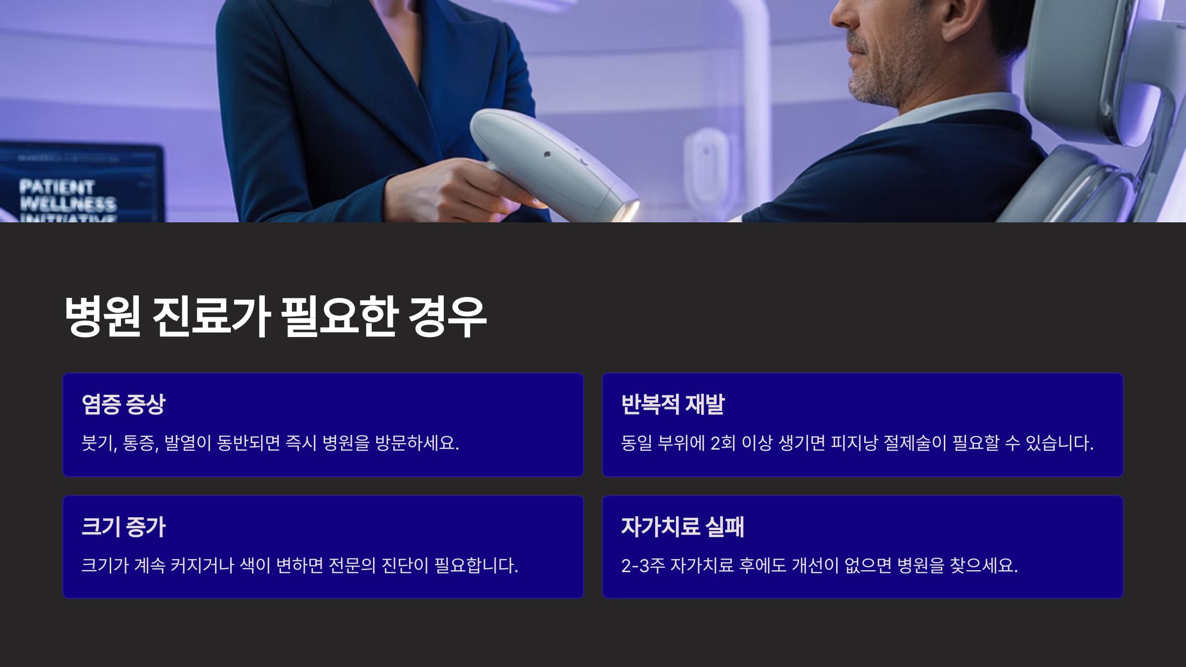 피지낭종의 자가치료는 초기 단계에서 증상 완화에는 도움이 될 수 있지만, 완전한 치료나 재발 방지에는 한계가 있습니다. 병원 진료와 병행하거나, 일시적 대응으로 활용하는 것이 가장 안전한 방법입니다. 무엇보다 중요한 건 무리하지 않고, 꾸준히 관리하는 자세입니다.