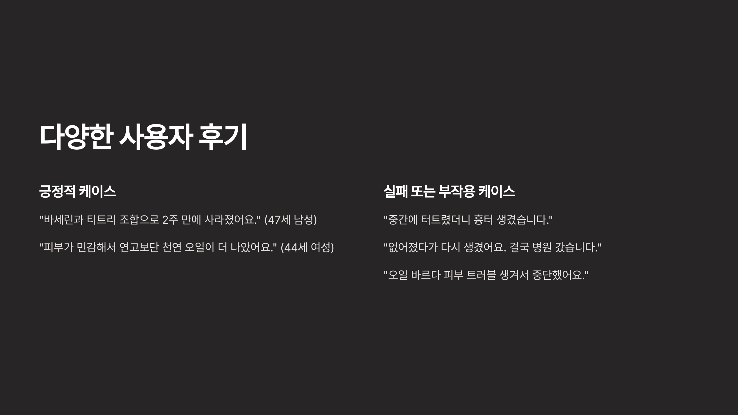 - “바셀린과 티트리 조합으로 2주 만에 사라졌어요.” (47세 남성)