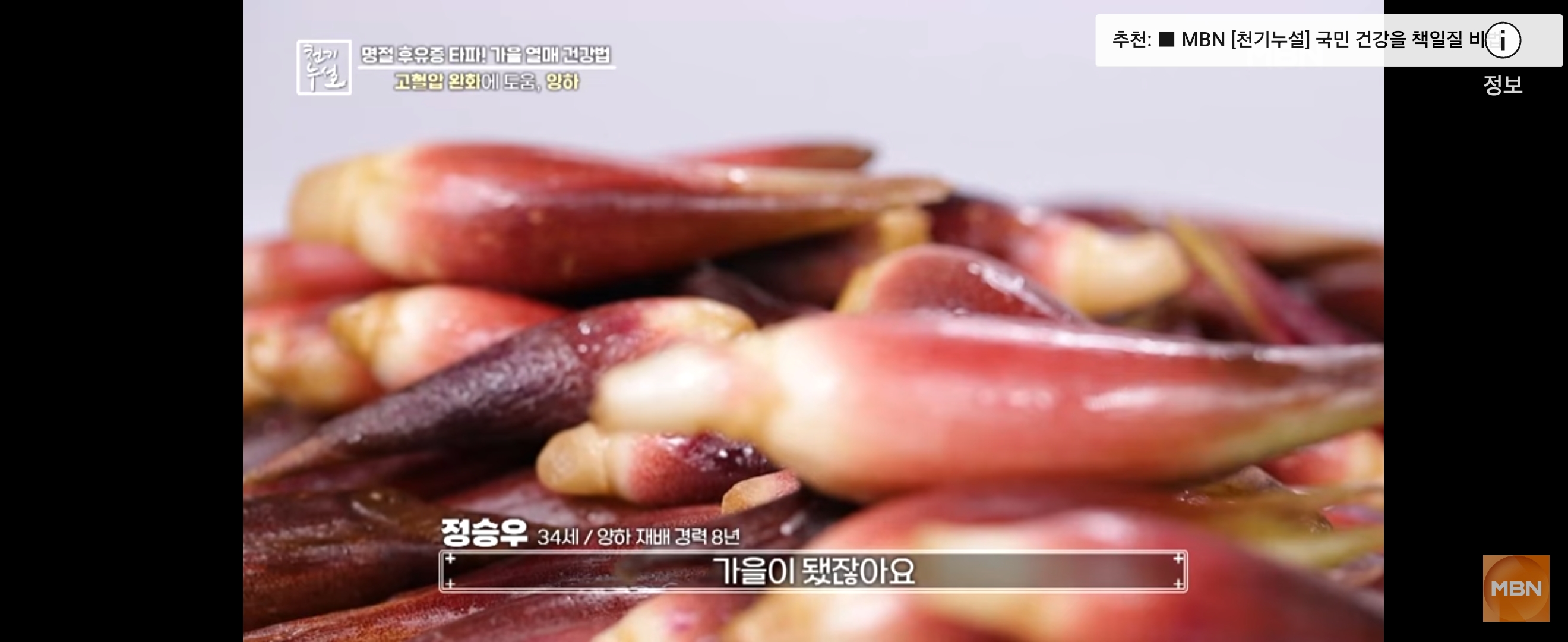 고혈압 환자에게 유익한 '보랏빛 열매'인 양하에 대해 소개하며, 이 식재료가 가진 혈액 순환 촉진 효과를 강조합니다. 추석 기간 동안의 건강을 지키기 위해 필요한 예방 조치를 알리는 영상으로, 명절 후유증을 효율적으로 관리할 수 있는 방법들을 배울 수 있습니다. 양하라는 식재료의 건강 효능에 대해 자세히 설명하고 양하는 혈액 순환과 혈압 안정에 도움을 주는 약재로서 과거부터 많은 사랑을 받아왔습니다. 특히, 가을에 수확한 양하의 꽃봉오리는 영양이 풍부하고 항산화 작용이 뛰어나 고혈압 완화에도 효과적이라는 점을 강조합니다. 또한 양하의 사용법과 요리 활용 방법에 대한 소개를 통해 이 독특한 식재료를 생활에 어떻게 접목할 수 있는지를 배울 수 있습니다. 그리고 양하 요리의 특별한 매력을 소개하며, 특히 양하 장아찌 만들기와 건강상의 이점을 강조합니다. 양하가 혈관 건강에 도움을 주는 특성 및 이를 활용한 요리법을 자세히 설명하면서, 전통적인 음식의 중요성과 현대적인 식습관의 조화를 보여줍니다.