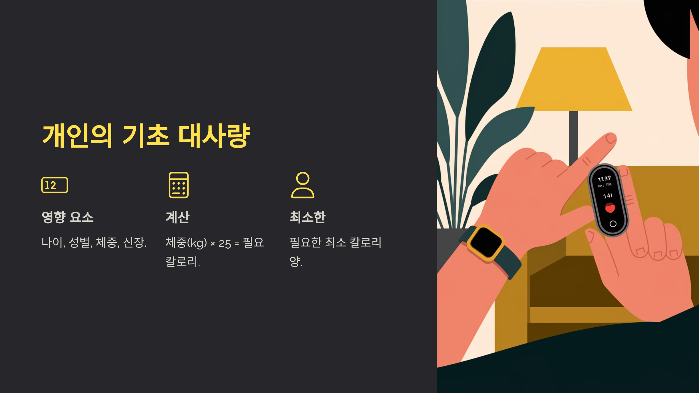 기초 대사량은 우리가 아무 활동도 하지 않을 때, 기본적인 생명 유지 기능을 위해 필요한 에너지의 양입니다. 이는 나이, 성별, 체중, 신장 등 여러 요소에 따라 달라집니다. 예를 들어, 30대 초반의 여성과 50대 중반의 남성은 기초 대사량이 다르기 때문에 각각 적절한 칼로리 섭취량도 다릅니다. 기초 대사량을 계산하는 방법은 여러 가지가 있지만, 가장 간단한 방법 중 하나는 "하루에 체중(kg) × 25"로 계산하는 것입니다. 이를 통해 나에게 필요한 최소한의 칼로리 양을 알 수 있습니다.