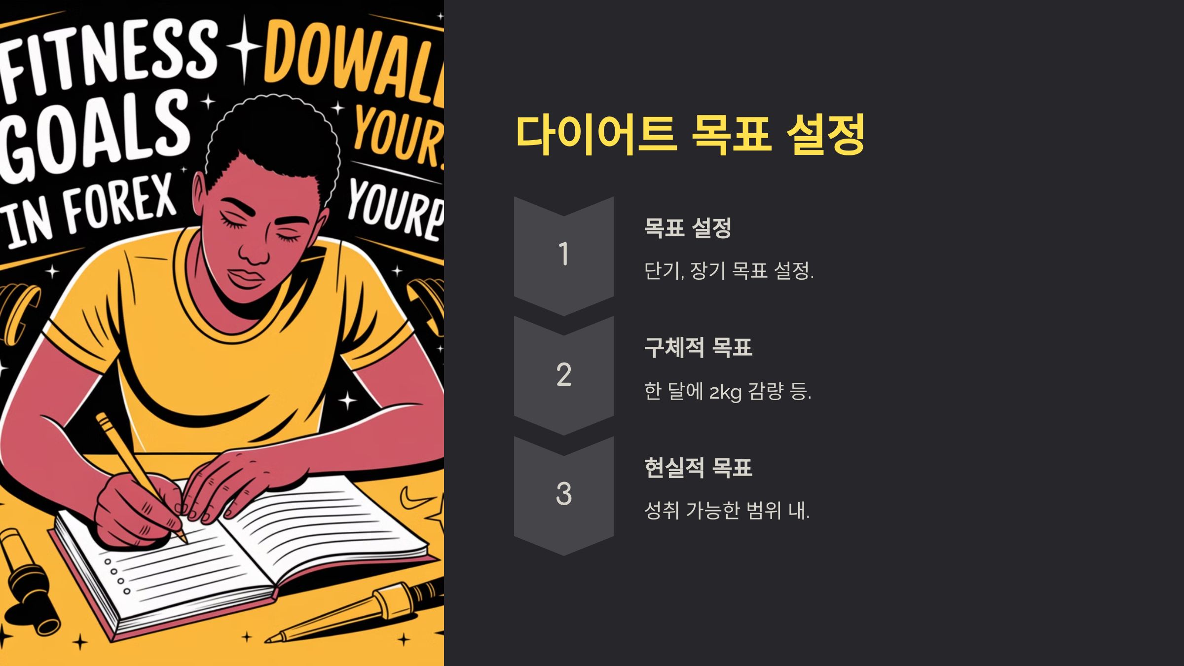 체중 감량을 원한다면, 목표를 명확히 설정하는 것이 중요합니다. 단기적인 목표와 장기적인 목표를 설정해 보세요. 예를 들어, "한 달에 2kg 감량하기"와 같은 구체적인 목표가 도움이 됩니다. 목표가 생기면 그에 맞는 계획을 세우는 것이 쉬워집니다. 목표를 설정할 때는 현실적이고 성취 가능한 범위 내에서 설정하는 것이 중요합니다. 지나치게 높은 목표를 설정하면 오히려 스트레스를 받아 포기할 수 있으니 주의해야 합니다.