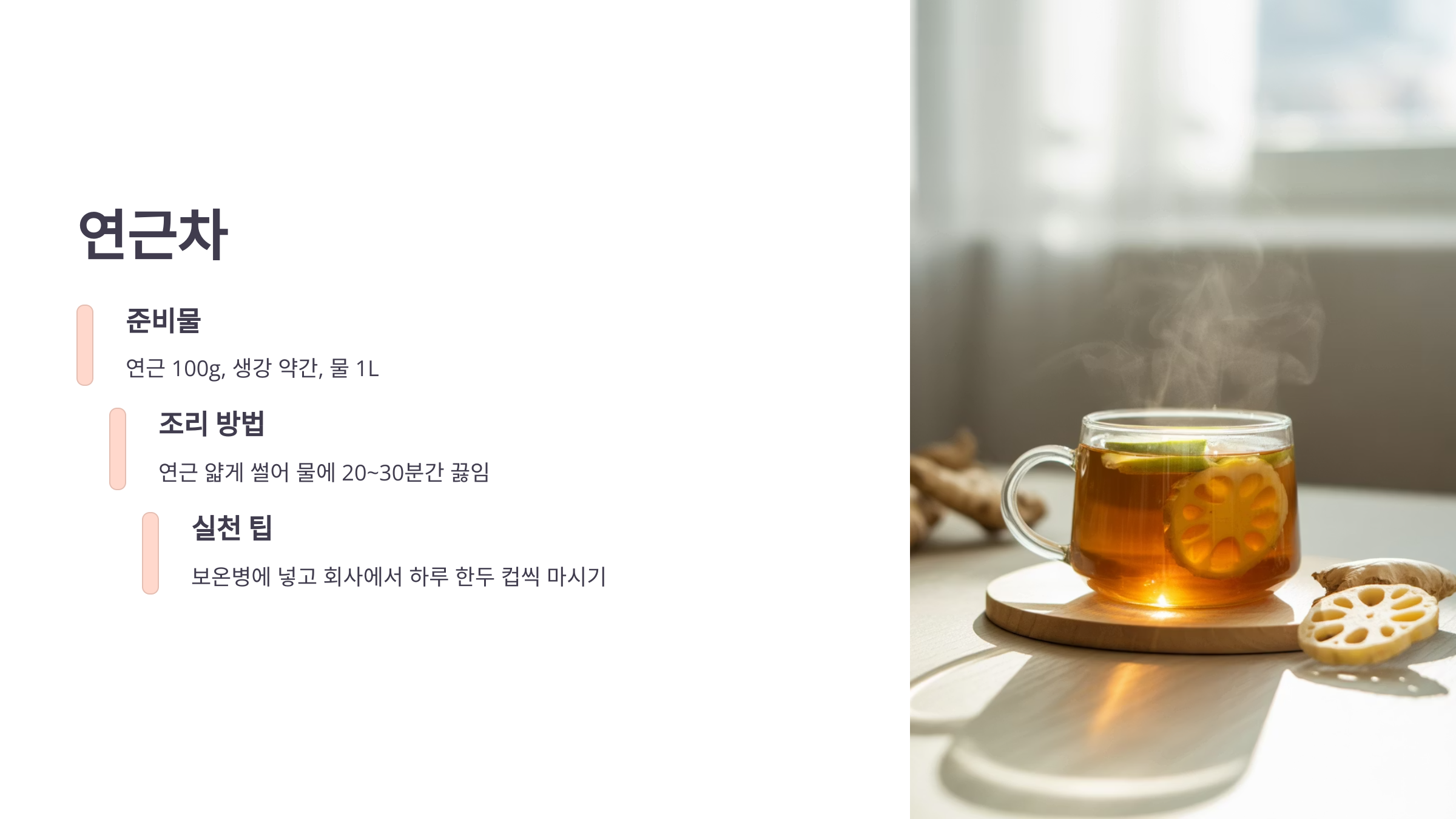 조리 방법: 연근을 얇게 썰어 물에 20~30분간 끓입니다. 생강을 함께 넣으면 향과 면역 효과가 상승합니다. 따뜻하게 마시면 피로 해소에 탁월합니다.