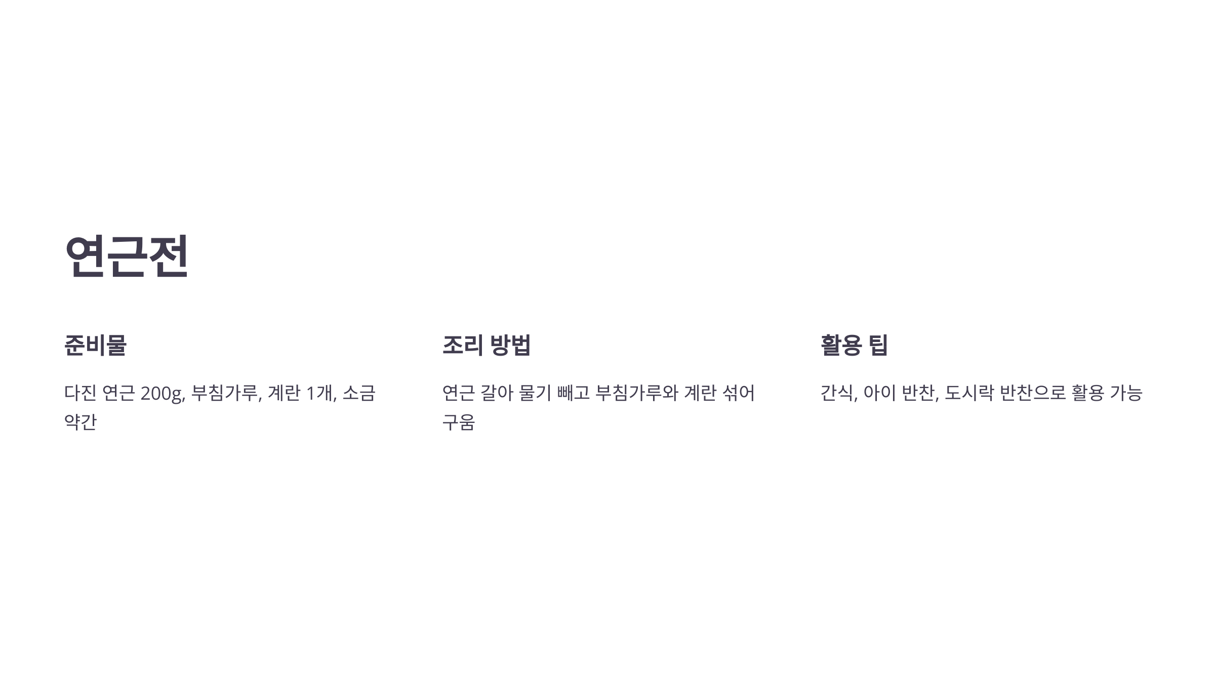 조리 방법: 연근을 강판에 갈아 체에 물기 빼고, 부침가루와 계란을 섞어 팬에 한 숟갈씩 올려 구워냅니다. 고소하고 쫀득한 식감이 특징입니다.