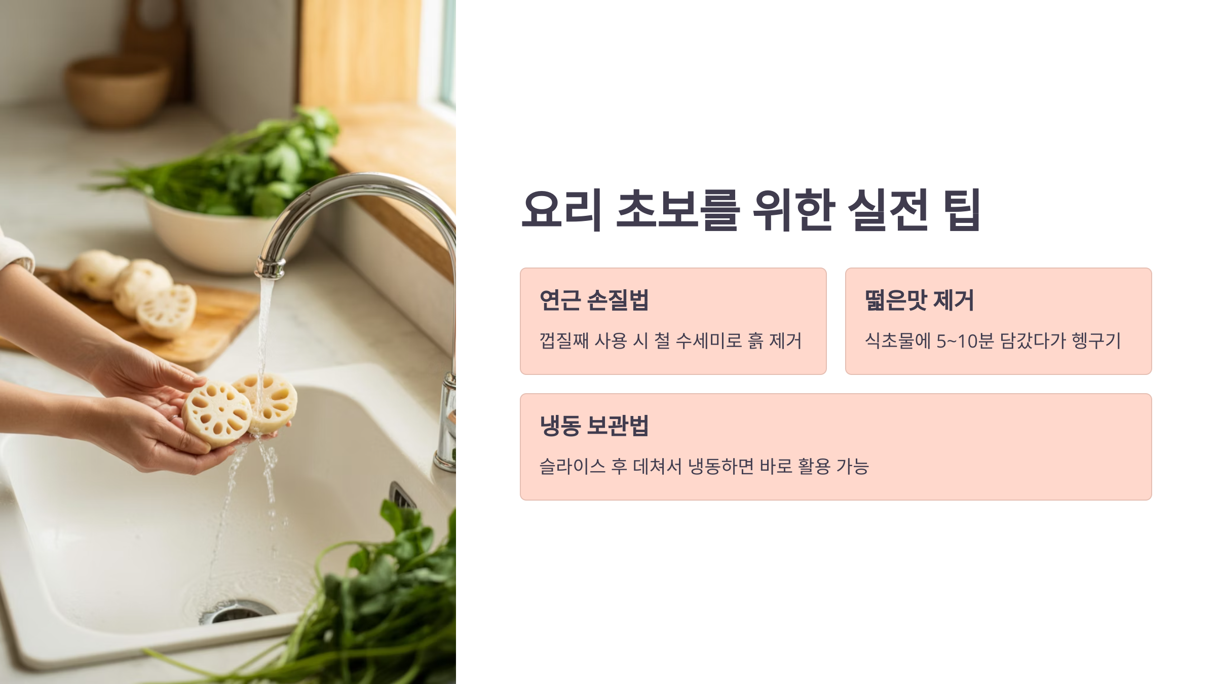- 연근 손질법: 껍질째 사용하는 경우, 철 수세미로 살살 문지르면 흙 제거가 쉽습니다.