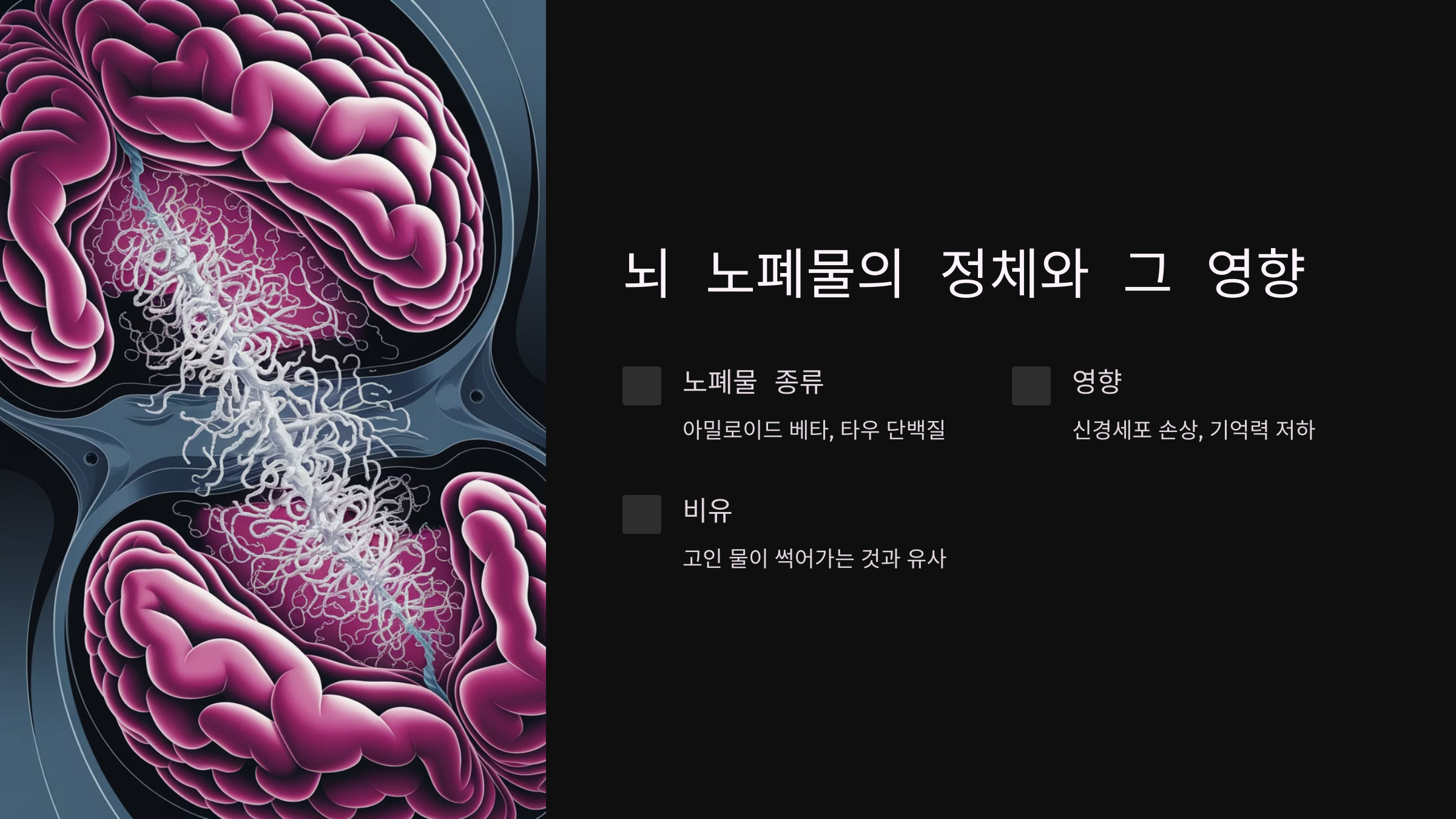 뇌 속의 노폐물은 주로 아밀로이드 베타와 타우 단백질로 구성되어 있습니다. 이들은 뇌세포 간의 소통을 방해하고, 신경세포를 손상시킵니다. 예를 들어, 아밀로이드 베타가 뇌에 쌓이면, 신경세포가 서로 연결되는 것을 방해하여 기억력과 사고 능력에 악영향을 미칩니다. 이는 마치 고인 물이 썩어가는 것과 같습니다. 시간이 지남에 따라 뇌의 기능이 저하되고, 결국 치매로 이어질 수 있습니다.