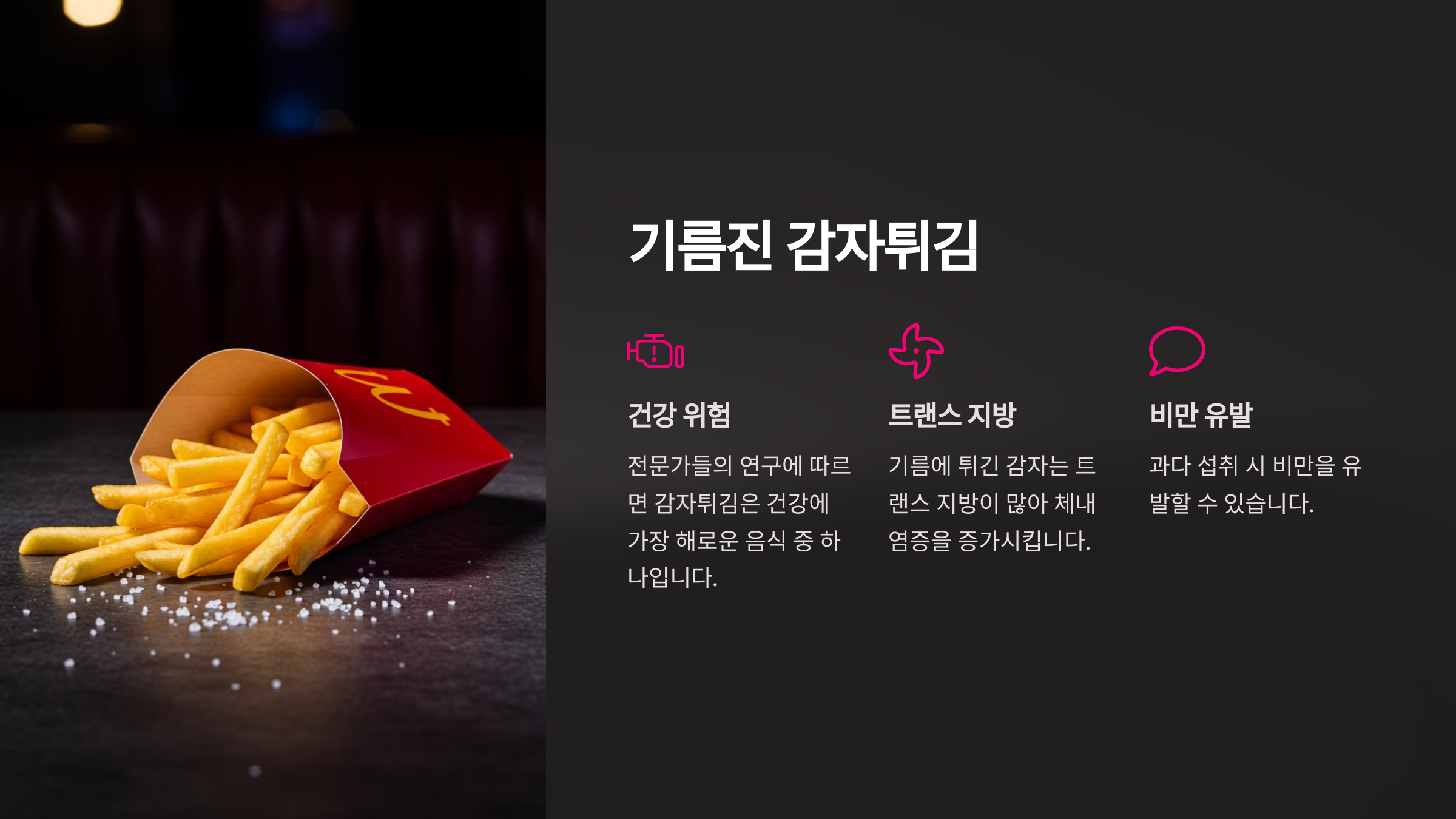 전문가들의 특별한 연구에 따르면 감자튀김은 건강에 가장 해로운 음식 중 하나입니다. 기름에 튀긴 감자는 트랜스 지방이 많아 체내 염증을 증가시키고, 비만을 유발할 수 있습니다.