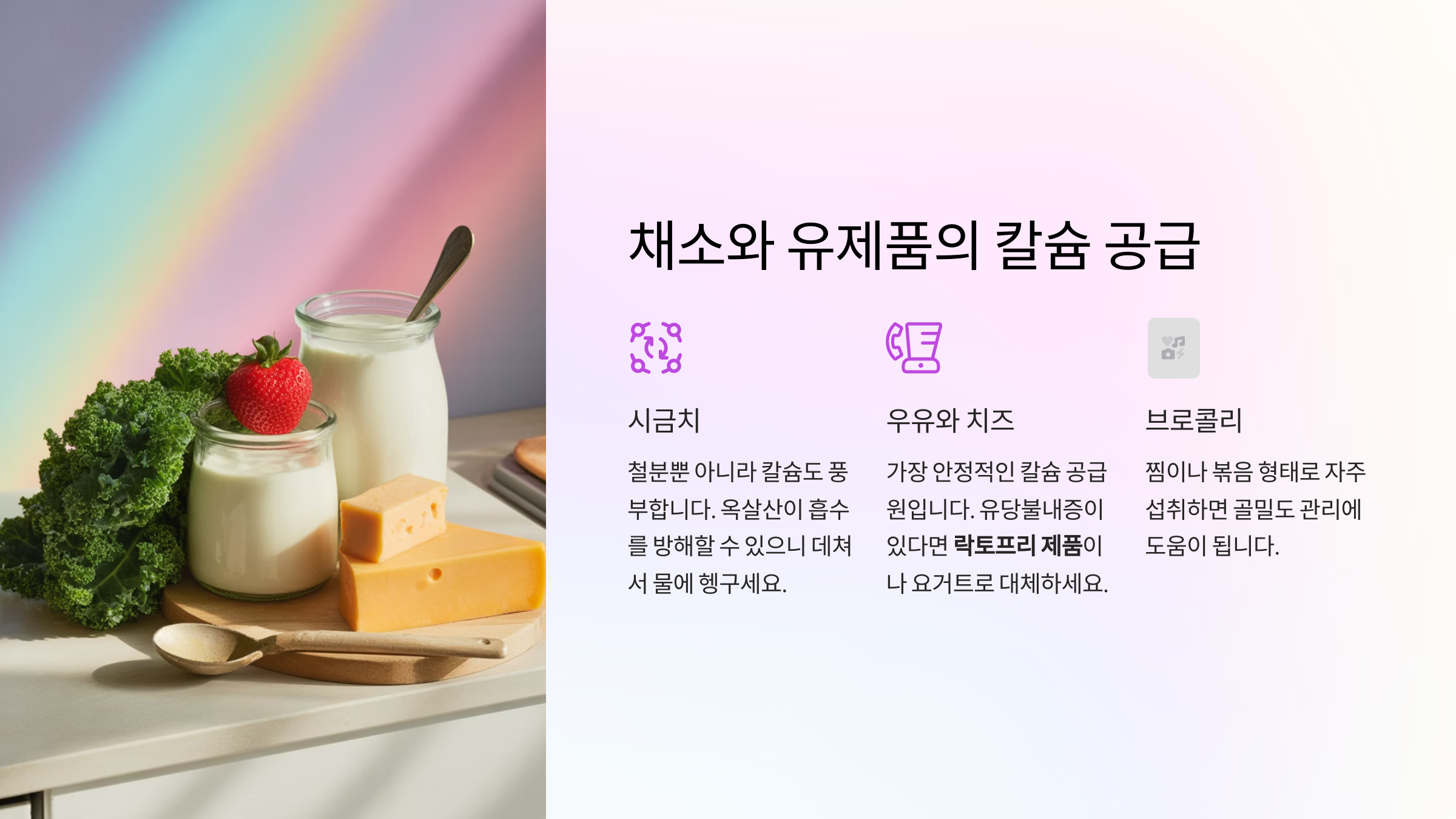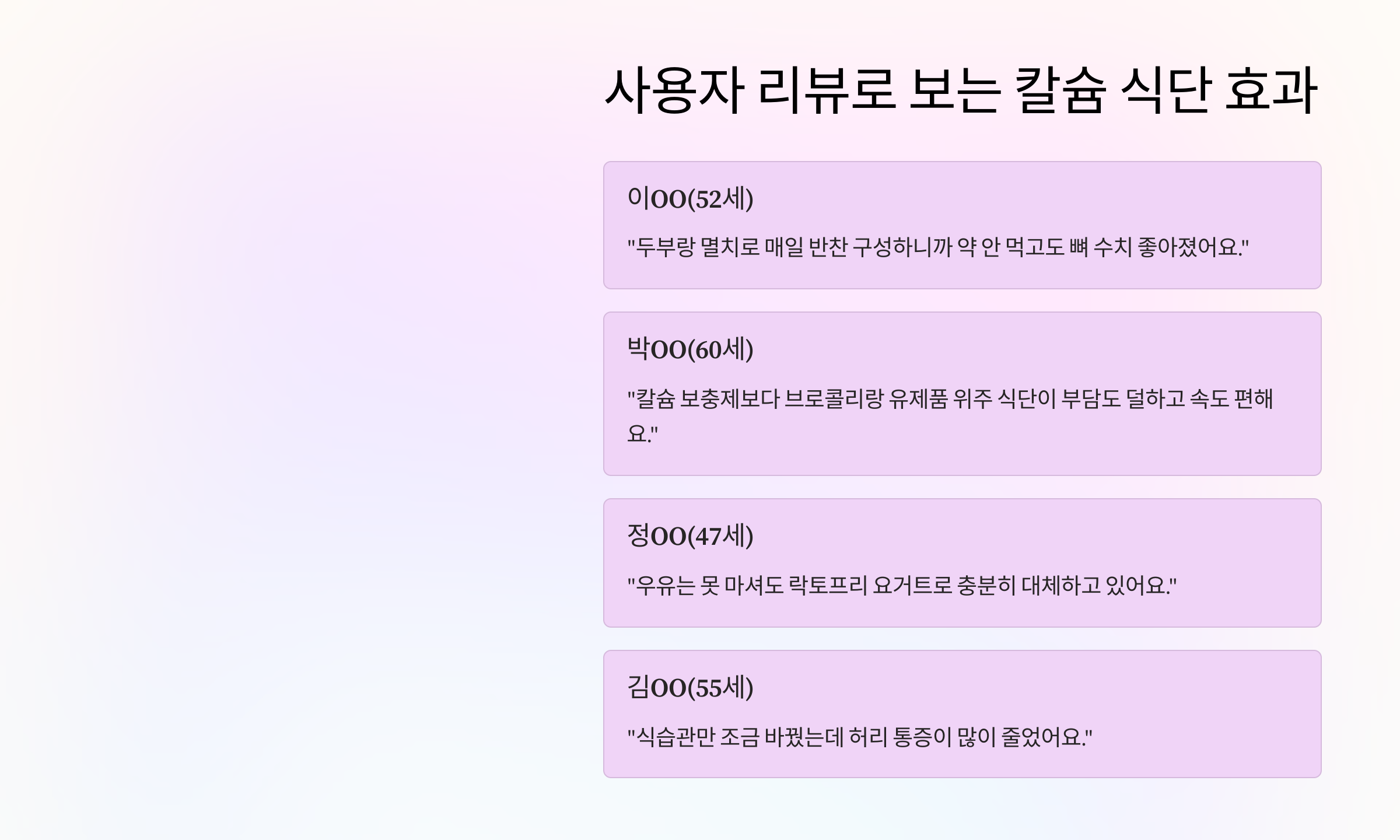 • 박 OO(60세): “칼슘 보충제보다 브로콜리랑 유제품 위주 식단이 부담도 덜하고 속도 편해요.”