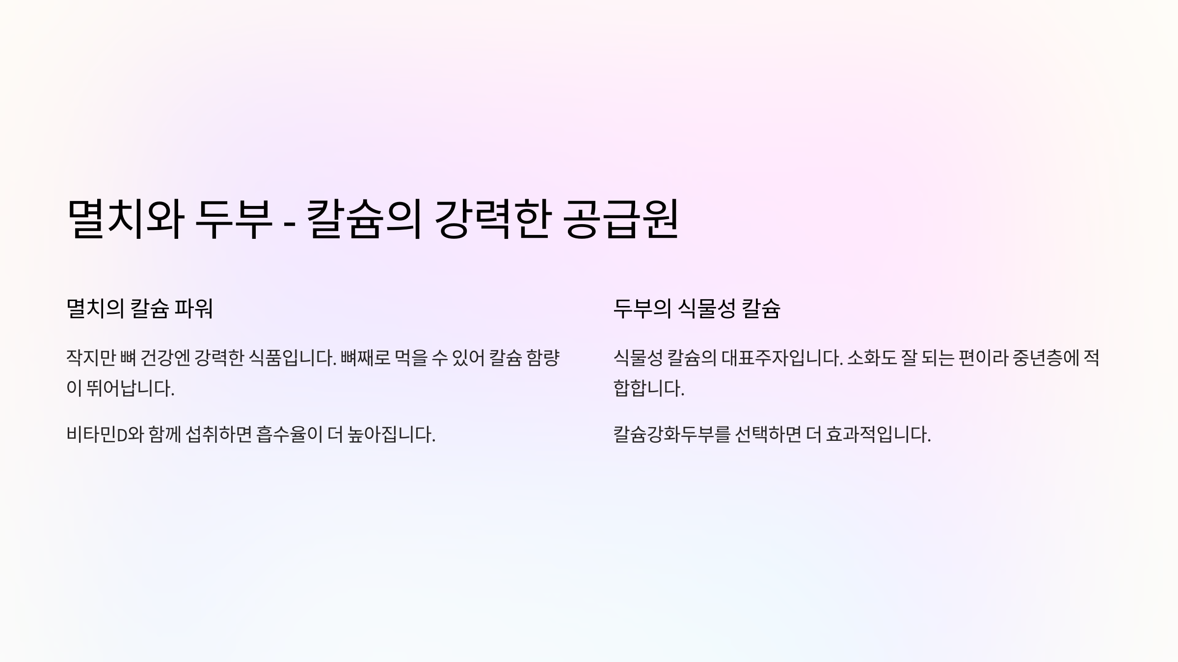 칼슘은 단기 복용보다 일상 식단에서의 꾸준한 섭취가 더 중요합니다. 식품 선택 하나하나가 뼈 건강을 좌우합니다. 오늘부터 멸치 한 줌, 두부 한 모로 건강한 뼈를 만들어보세요.