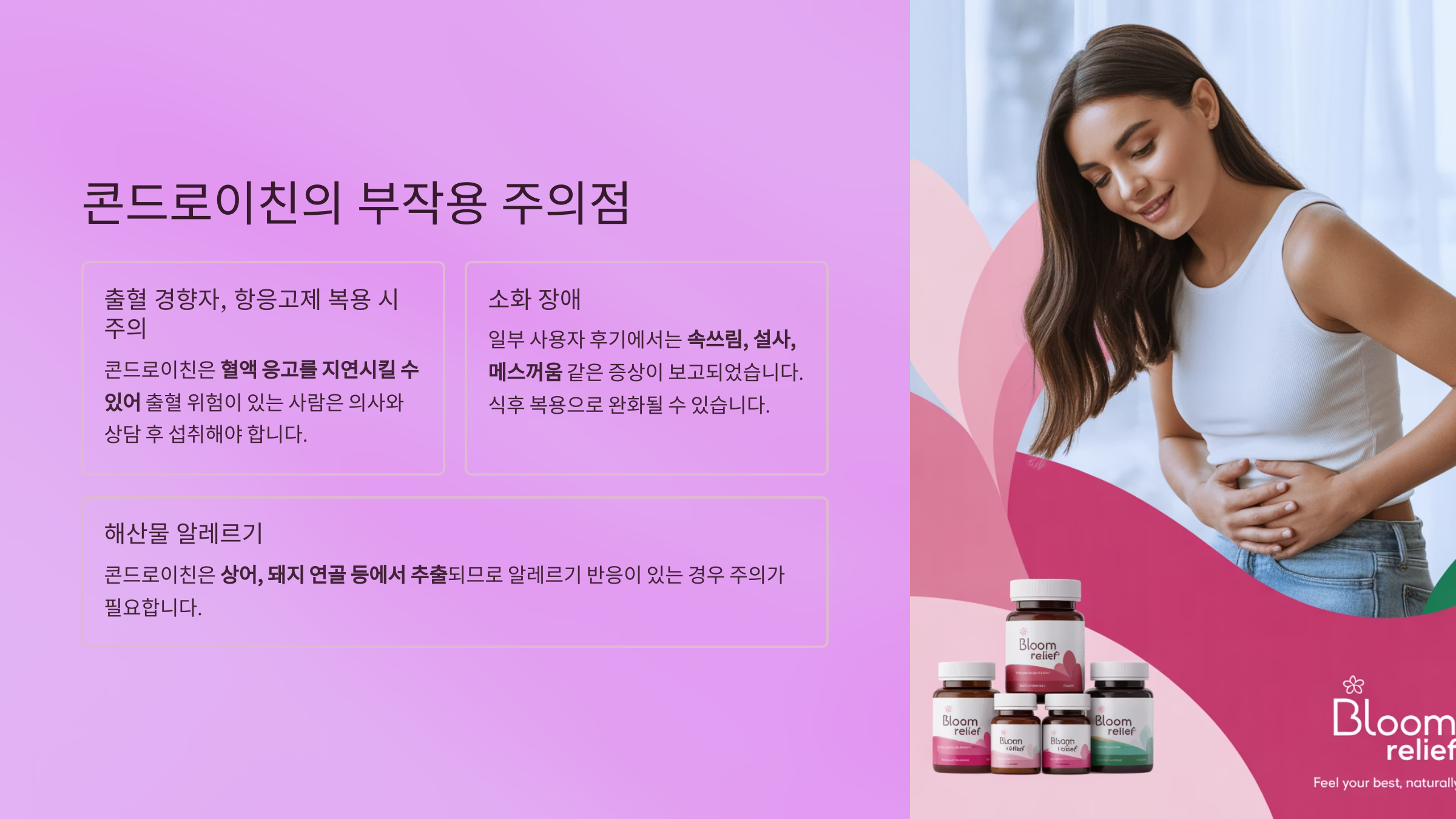 콘드로이친은 상어, 돼지 연골 등에서 추출되므로 알레르기 반응이 있는 경우 주의가 필요합니다.