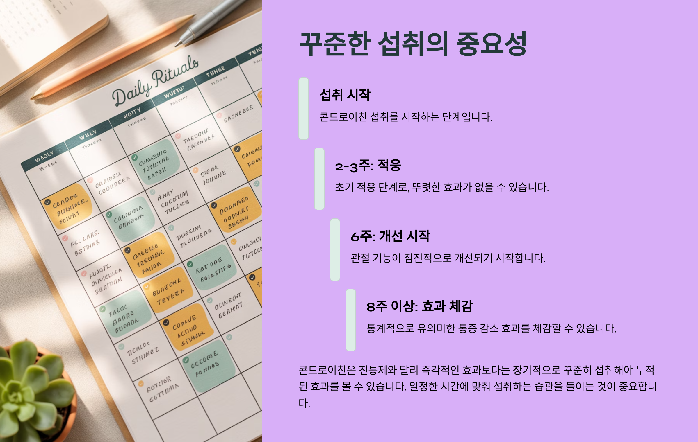 콘드로이친은 진통제가 아니기 때문에 즉각적인 효과를 기대하기보단 장기적으로 누적되는 효과를 기대해야 합니다. 연구에 따르면, 6~8주 이상 복용 시 관절 기능 개선과 통증 감소 효과가 통계적으로 유의미하게 나타났습니다.