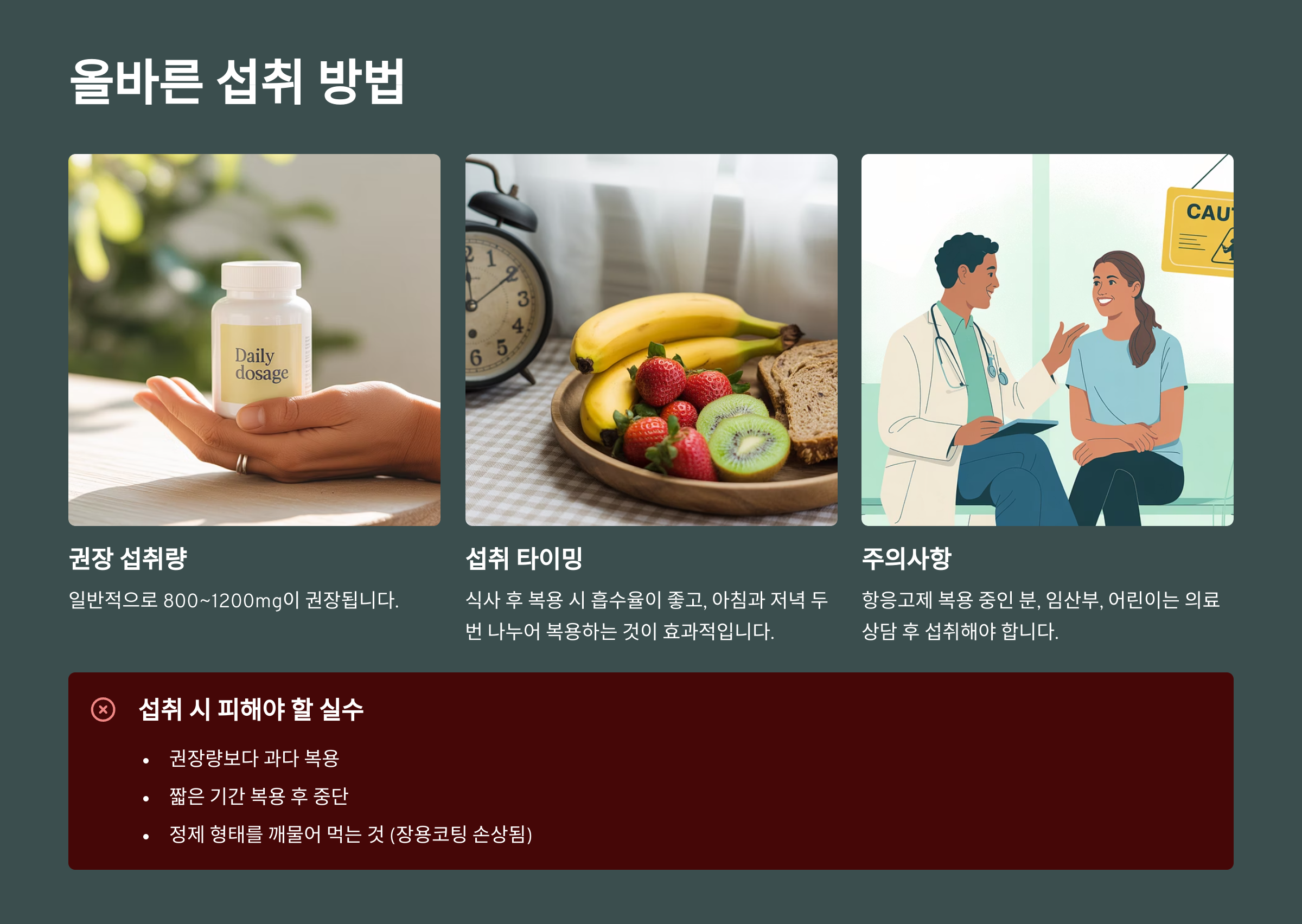 권장 섭취량은 보통 800~1200mg입니다. 식사 후 복용 시 흡수율이 좋고, 위장 장애도 예방할 수 있습니다. 아침과 저녁 두 번 나누어 복용하는 것이 가장 일반적인 방법입니다.