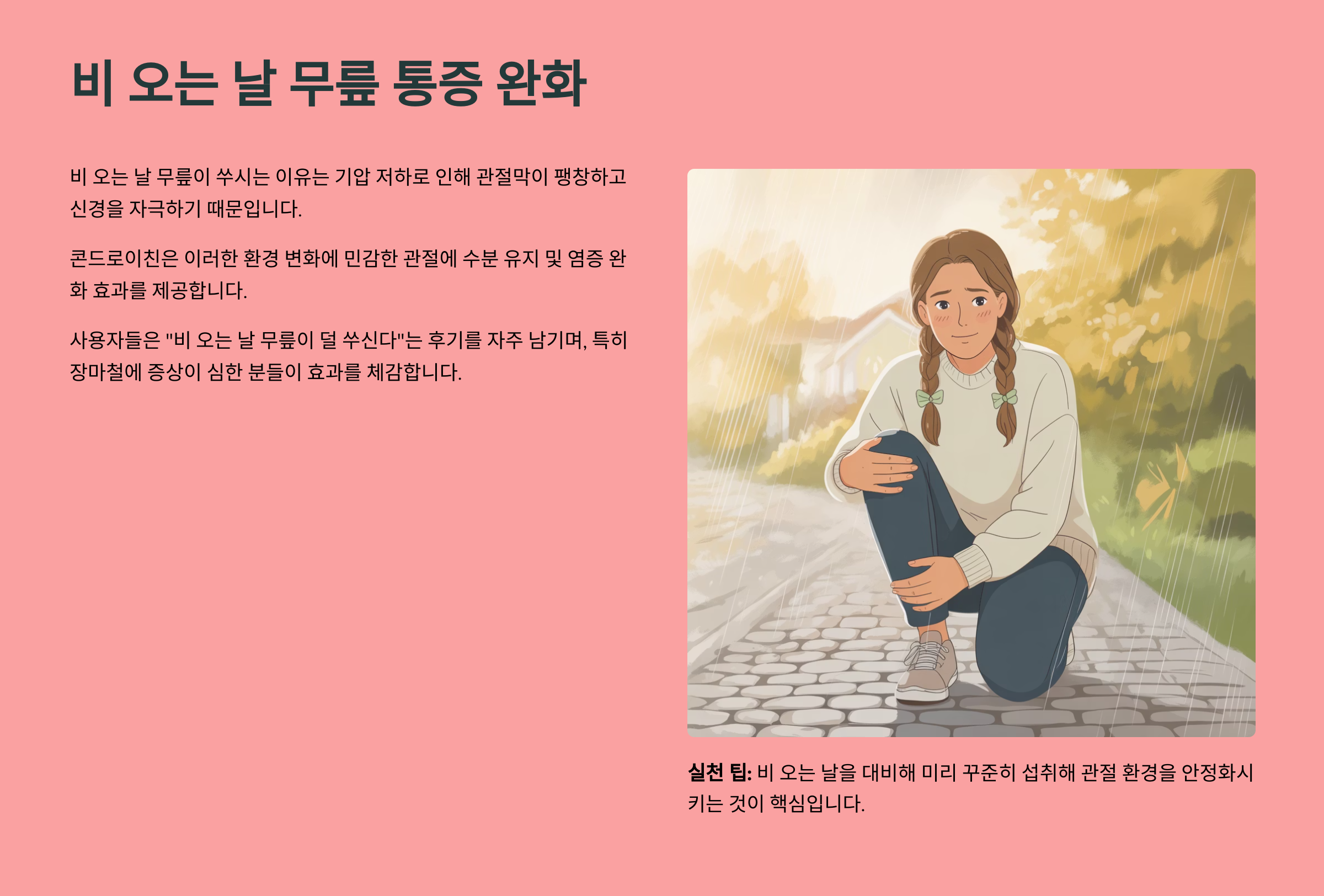 > ✅ 실천 팁: 비 오는 날을 대비해 미리 꾸준히 섭취해 관절 환경을 안정화시키는 것이 핵심입니다.