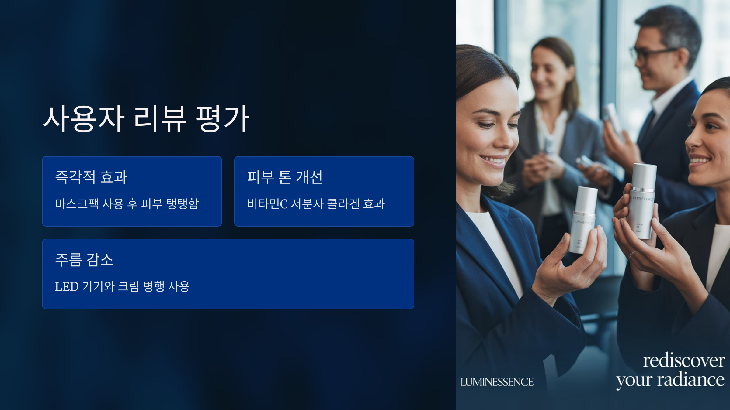 • “LED 기기와 콜라겐 크림 병행하니 주름이 확실히 줄었어요.” – 43세 여성