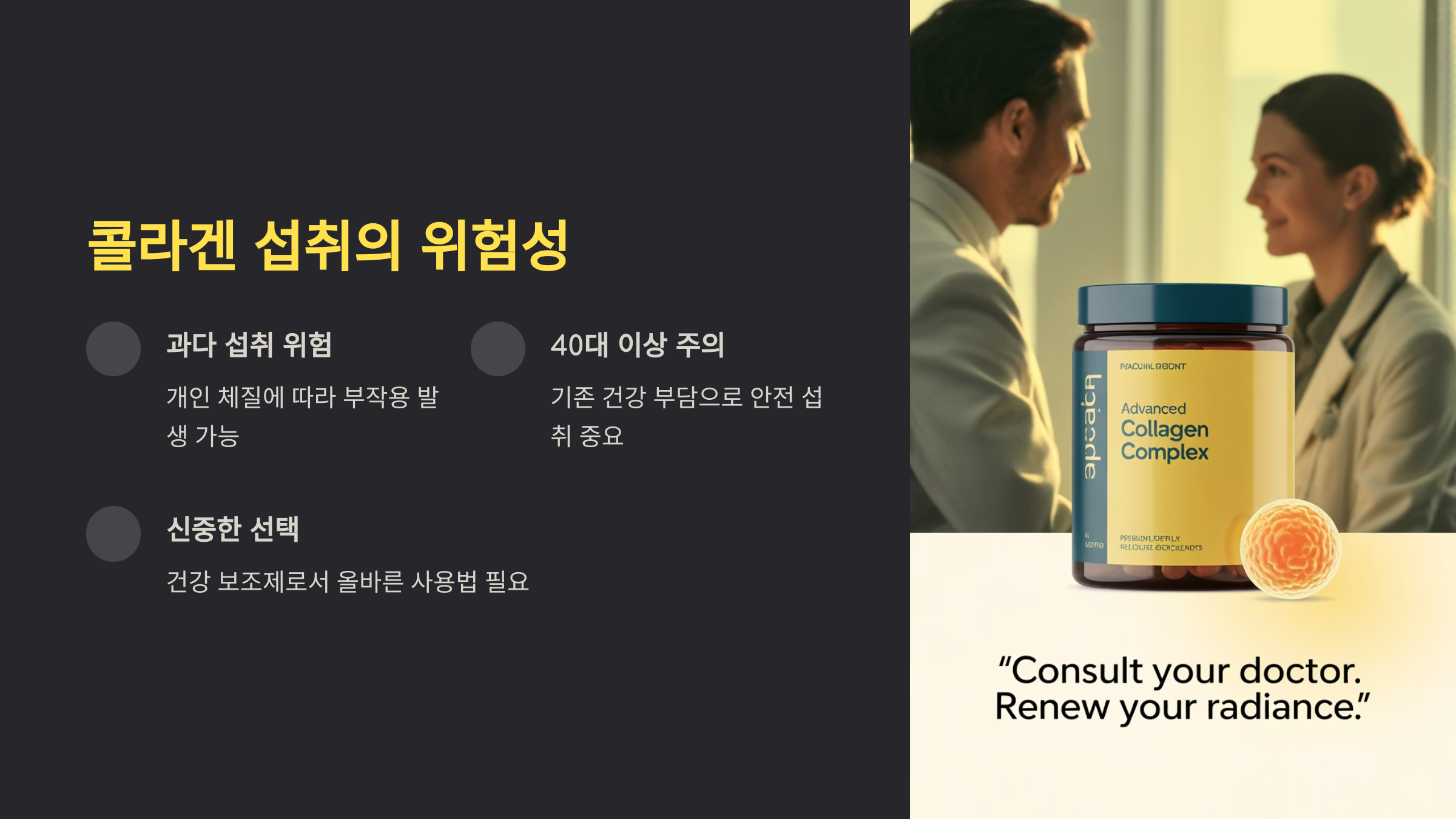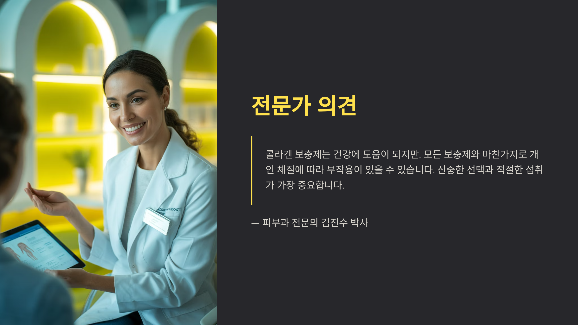 “콜라겐 보충제는 건강에 도움이 되지만, 모든 보충제와 마찬가지로 개인 체질에 따라 부작용이 있을 수 있습니다. 신중한 선택과 적절한 섭취가 가장 중요합니다.” — 피부과 전문의 김진수 박사