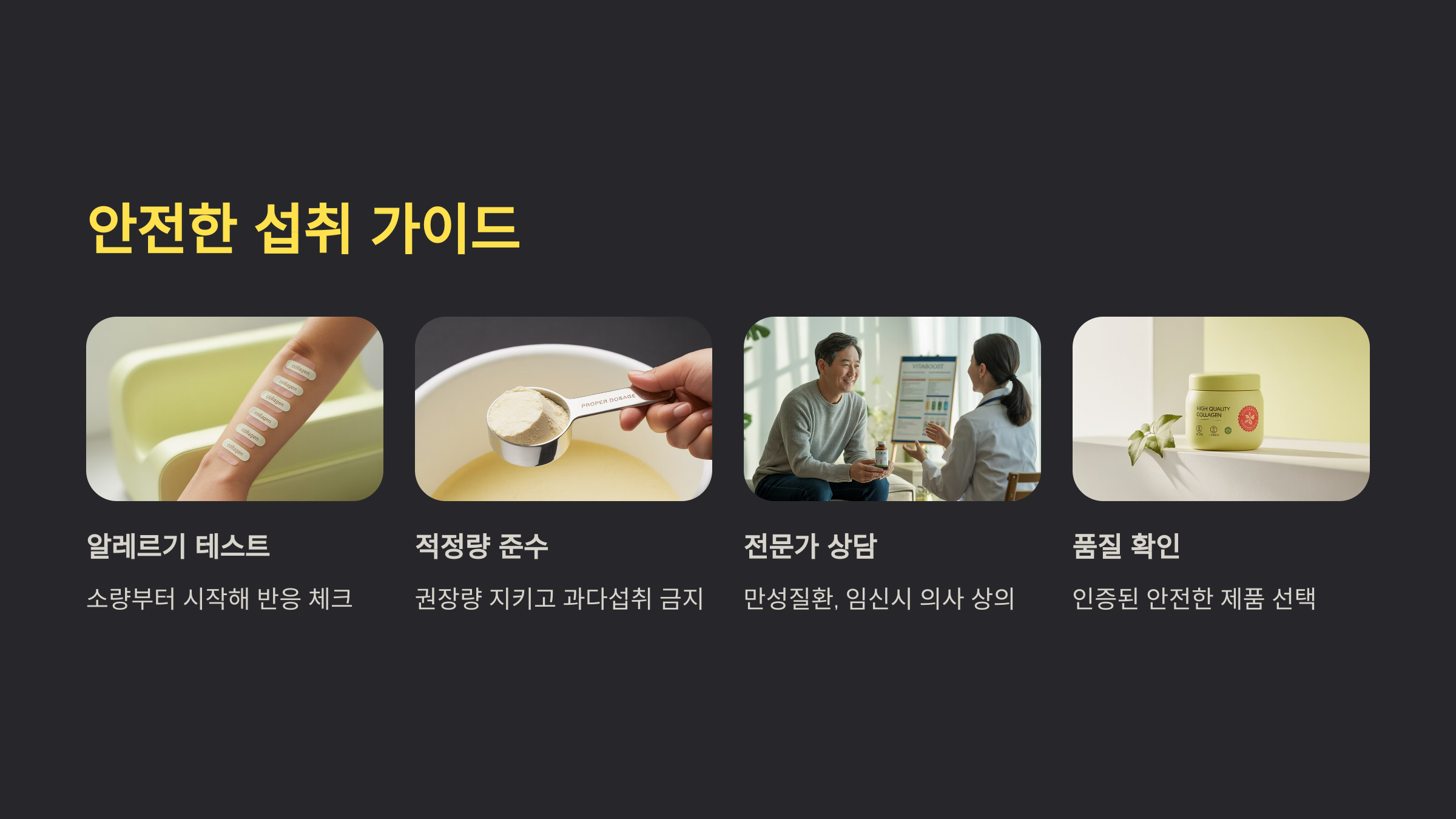 건강을 위해 먹는 콜라겐이지만, 모든 건강기능식품은 올바른 사용법과 적정량 준수가 중요합니다. 40대 이상 직장인은 업무 스트레스와 기존 건강 문제까지 고려해 꼭 안전을 최우선으로 해야 합니다. 개인별 체질과 상황에 맞는 섭취법을 찾아 건강을 지키세요.