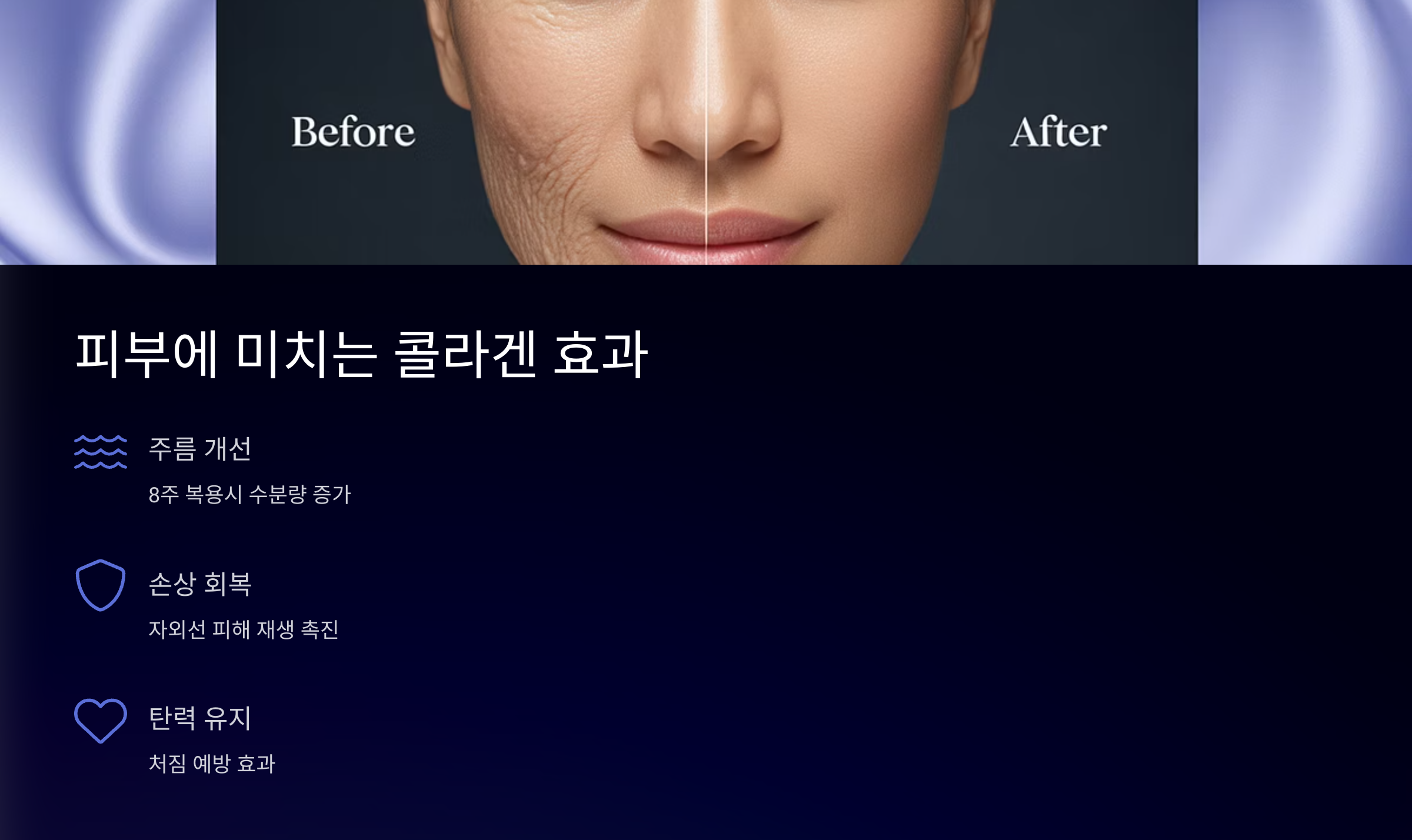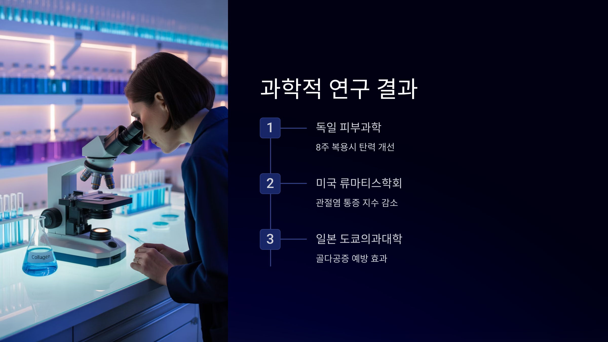 콜라겐은 피부 진피층을 구성하며 탄력을 유지하는 데 핵심 역할을 합니다. 실제로 콜라겐 펩타이드를 8주간 복용한 실험군은 피부 수분량과 탄력, 주름 개선에 유의미한 변화를 보였다는 독일 피부과학 연구 결과가 있습니다.