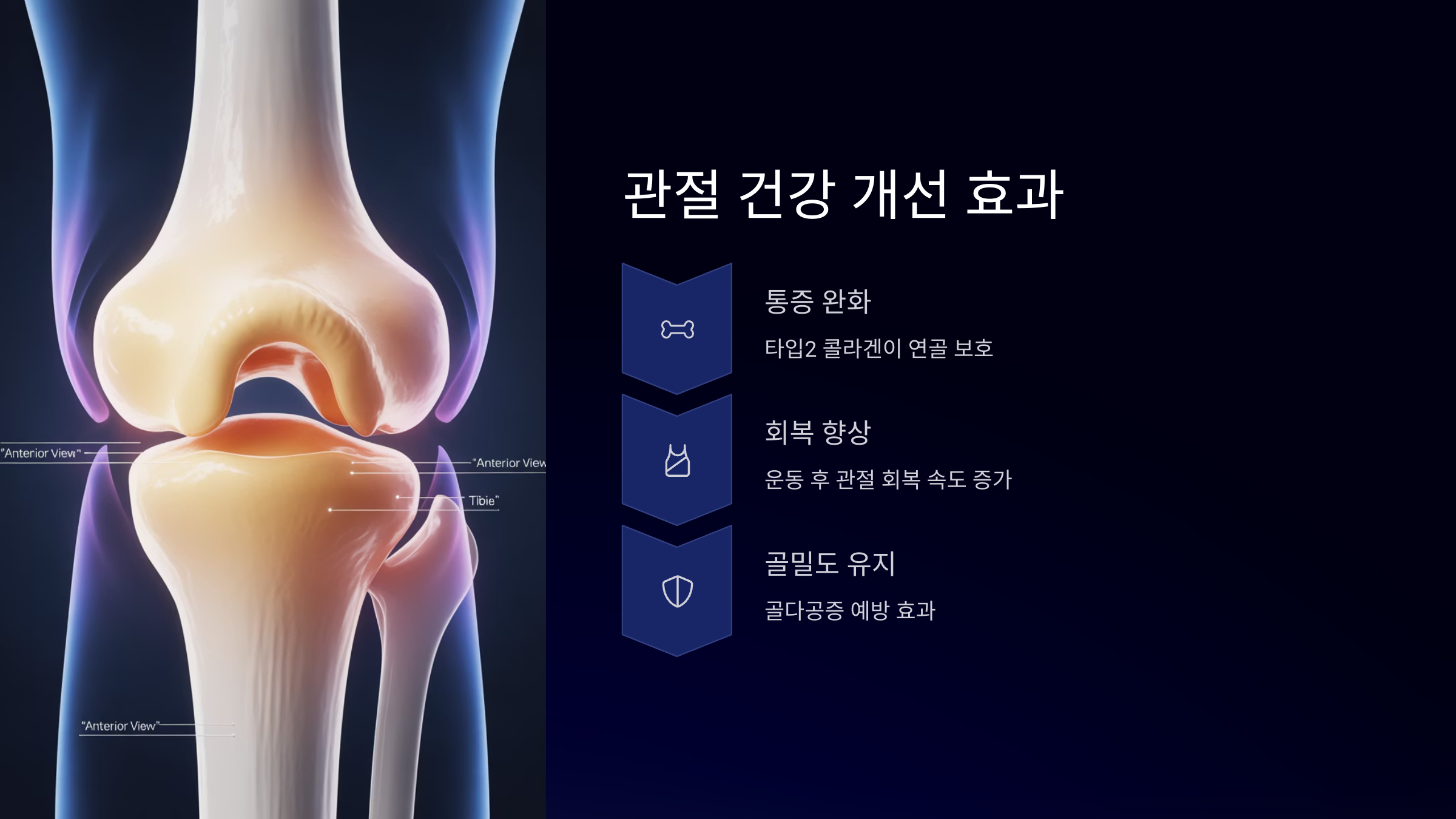 콜라겐 타입 2는 연골을 구성하는 주성분 중 하나로, 관절 마찰을 줄이고 충격을 완화합니다. 미국 류머티즘학회 발표에 따르면, 콜라겐 보충은 퇴행성 관절염 환자의 통증 지수를 낮추는 데 효과가 있었습니다.