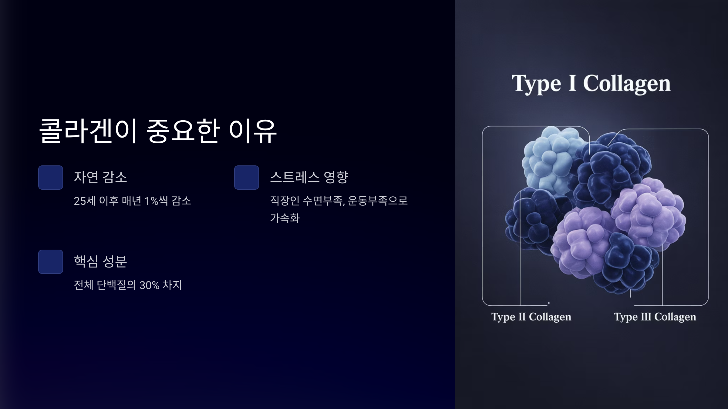 “콜라겐은 피부, 관절, 혈관 등 우리 몸의 결합조직을 구성하는 주요 단백질로 전체 단백질의 약 30%를 차지합니다.” — 대한피부과학회