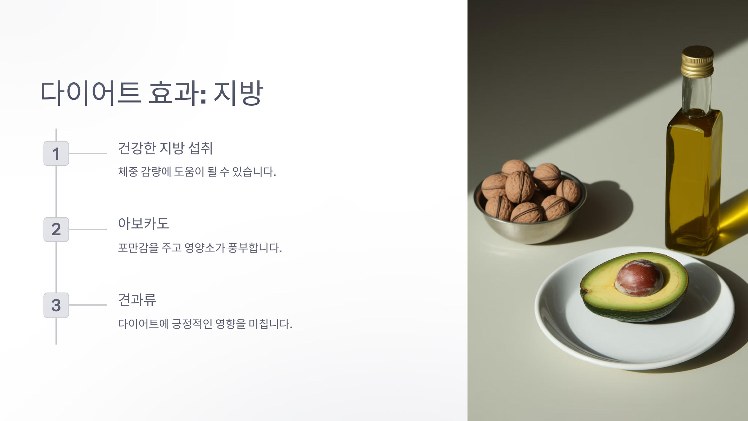 건강한 지방을 포함한 다이어트는 체중 감량에 도움이 될 수 있습니다. 예를 들어, 아보카도나 견과류는 포만감을 주고, 영양소가 풍부하여 다이어트에 긍정적인 영향을 미칩니다.