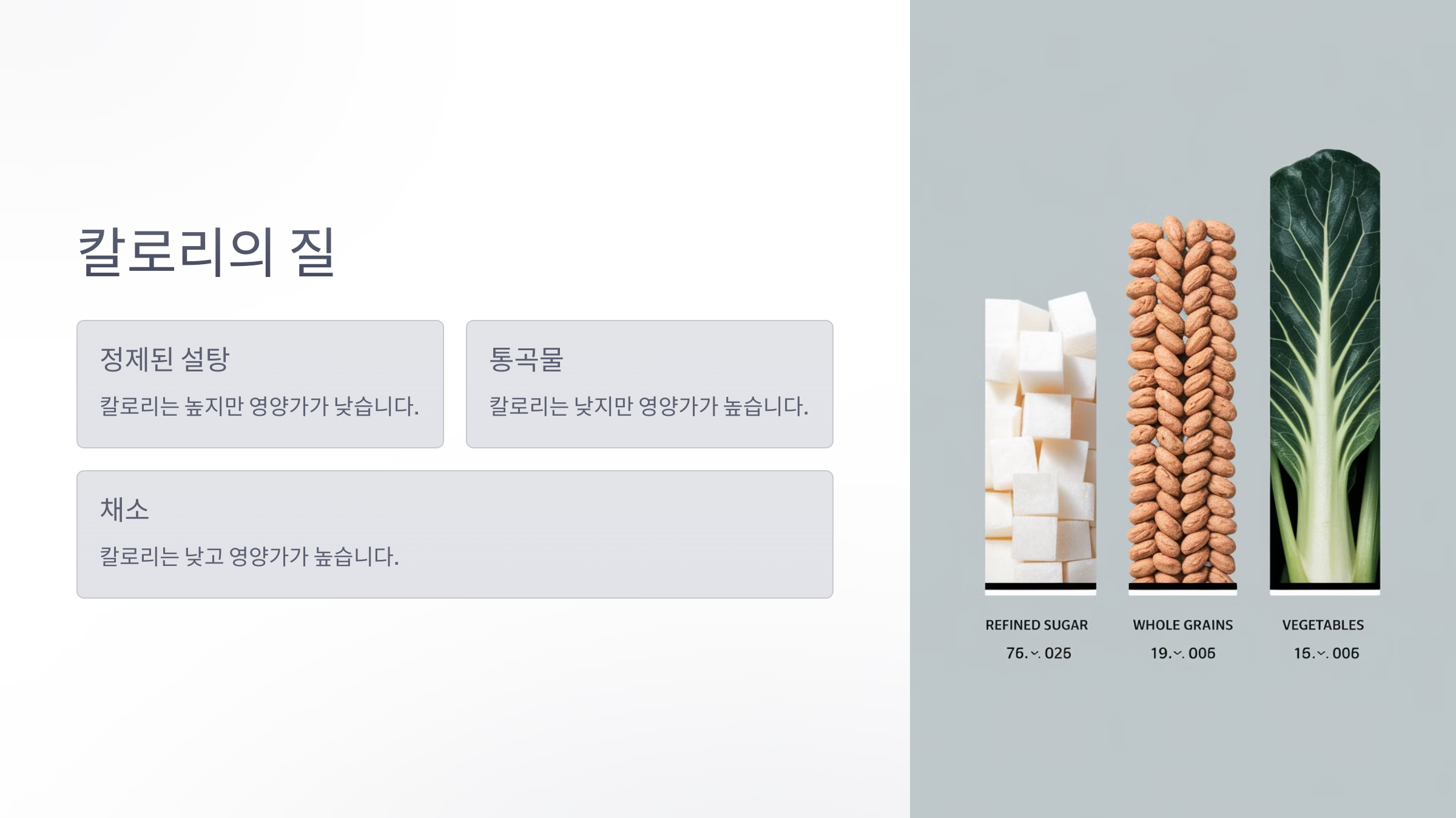 칼로리의 질도 중요합니다. 같은 칼로리라도 영양소의 종류에 따라 몸에 미치는 영향이 다릅니다. 예를 들어, 정제된 설탕이 많은 음식은 칼로리는 높지만 영양가는 낮습니다. 반면, 통곡물이나 채소는 칼로리는 낮지만 영양가는 높습니다.