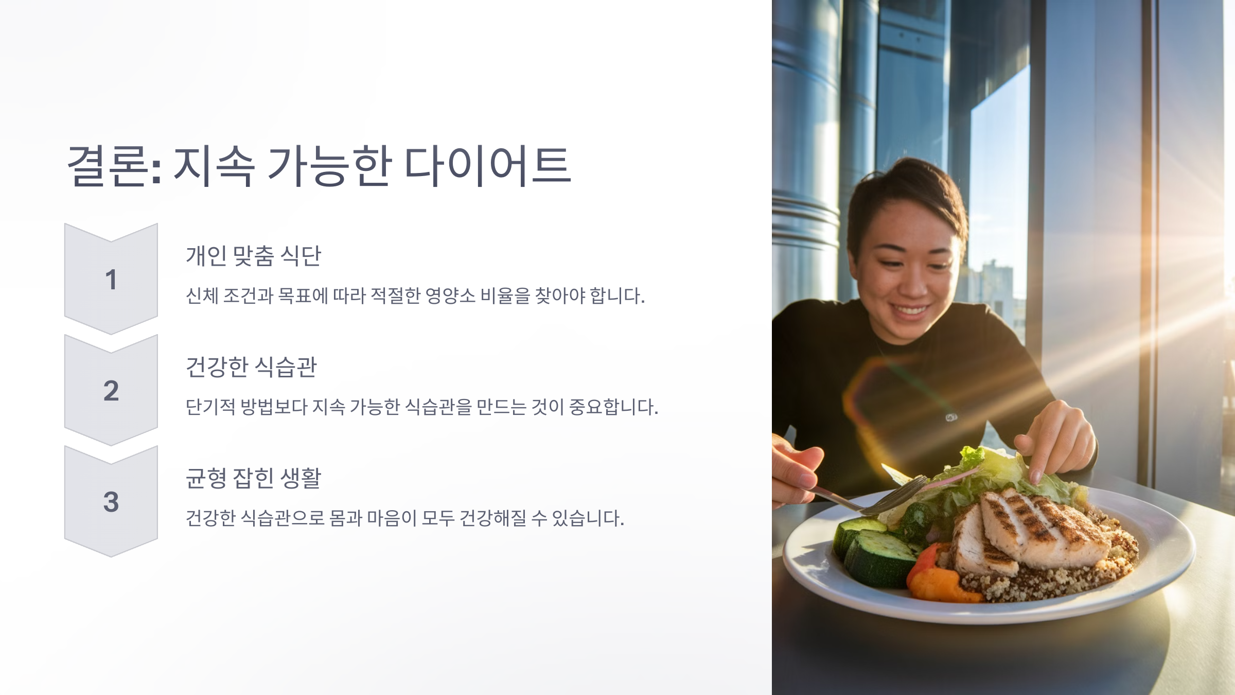 균형 잡힌 식단은 건강한 다이어트의 핵심으로, 탄수화물, 단백질, 지방은 모두 우리 몸에 필요한 영양소입니다. 이들 영양소를 적절히 조화롭게 섭취하는 것이 중요합니다. 개인의 신체 조건과 목표에 따라 필요한 영양소의 비율은 달라질 수 있으므로, 자신에게 맞는 식단을 찾는 것이 필수적입니다. 또한, 단기적인 다이어트 방법보다는 지속 가능한 식습관을 만드는 것이 더 중요하며, 건강한 식습관을 통해 몸과 마음이 모두 건강해질 수 있습니다. 이 글을 통해 탄수화물, 단백질, 지방의 칼로리 차이점과 다이어트 효과에 대한 이해가 깊어지길 바라며, 건강한 다이어트를 위해 균형 잡힌 식단이 필요하다는 점을 강조합니다. 여러분의 건강한 삶을 응원합니다!