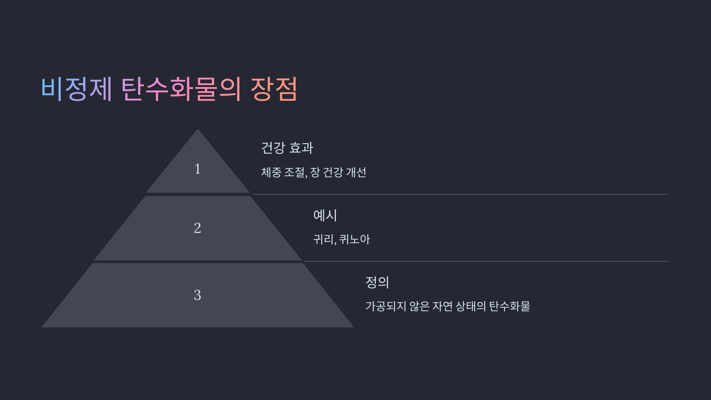 비정제 탄수화물은 체중 조절에 도움을 주며, 장 건강을 개선하는 데 기여합니다. 예를 들어, 귀리와 같은 곡물은 소화가 느려 포만감을 오래 유지시켜 줍니다.