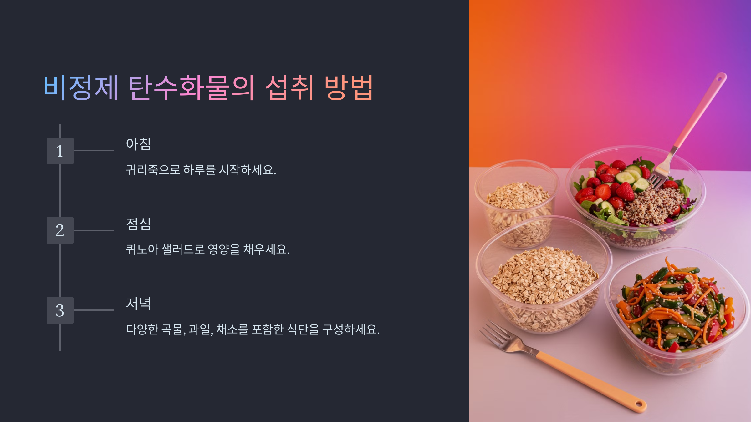비정제 탄수화물을 섭취하기 위해서는 다양한 곡물, 과일, 채소를 포함한 식단을 구성하는 것이 중요합니다. 예를 들어, 아침에 귀리죽을 먹거나, 점심에 퀴노아 샐러드를 선택하는 것이 좋습니다.