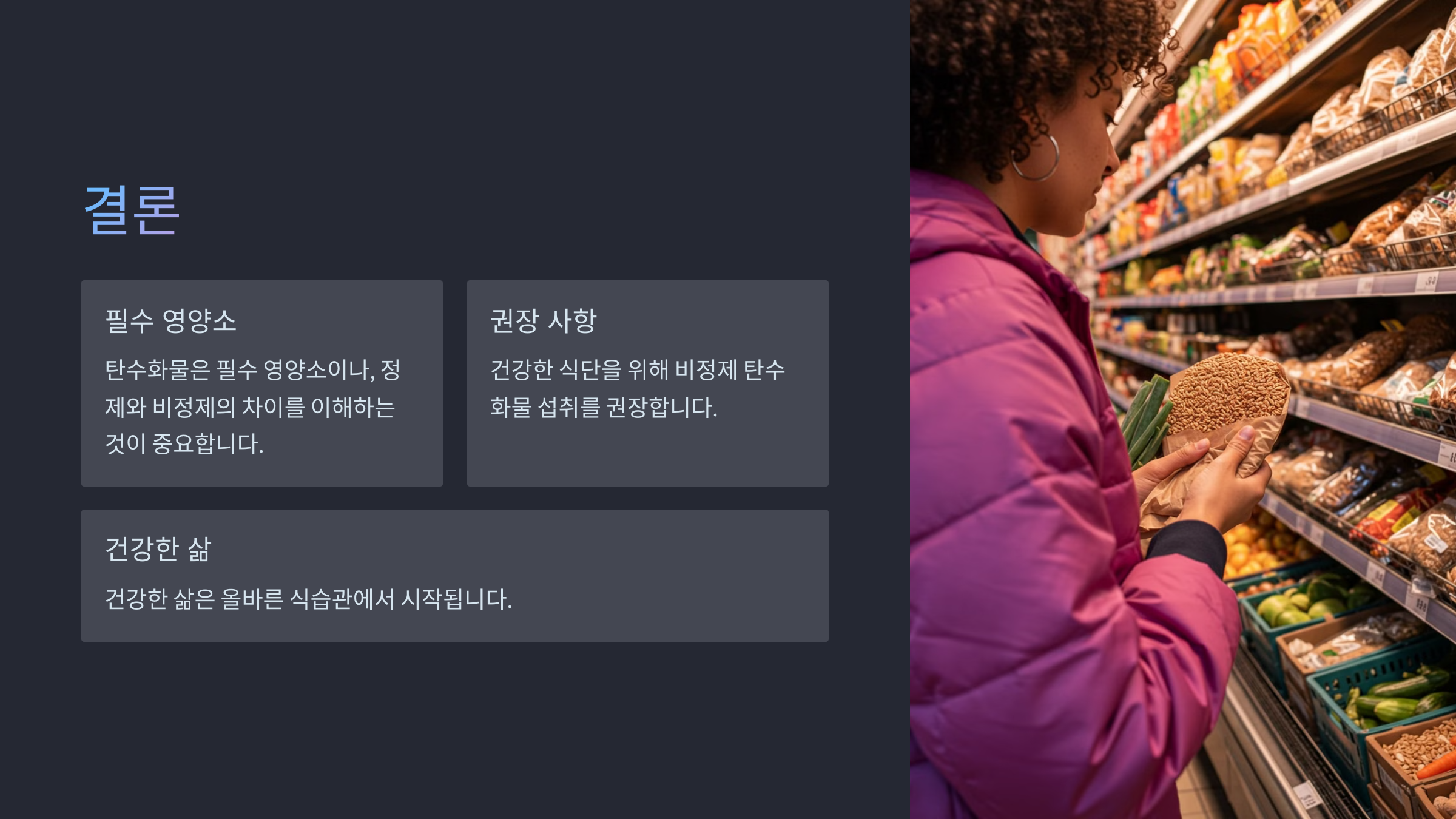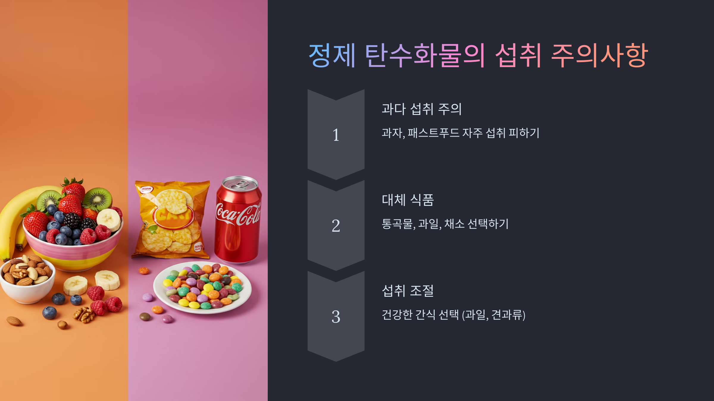 정제 탄수화물은 쉽게 섭취할 수 있지만, 과다 섭취는 건강에 해롭습니다. 예를 들어, 과자나 패스트푸드를 자주 먹는 것은 피해야 합니다.