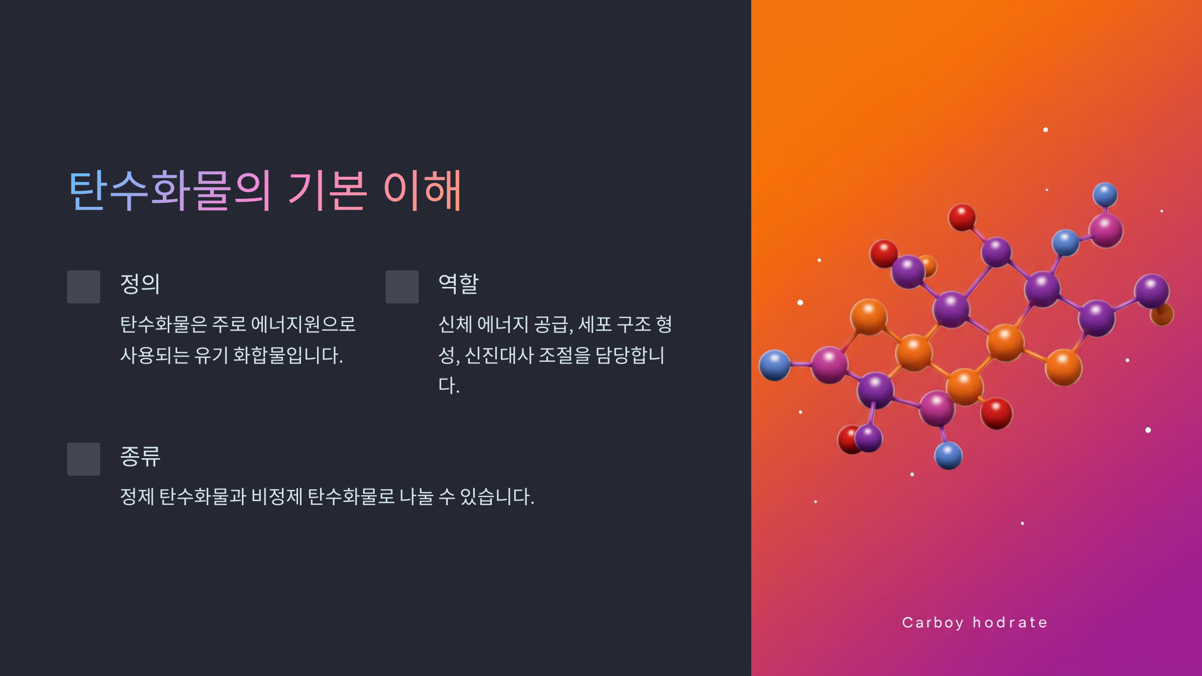 탄수화물은 주로 에너지원으로 사용되는 유기 화합물입니다. 이는 단당류, 이당류, 다당류로 나뉘며, 우리 몸에서 중요한 역할을 합니다. 예를 들어, 포도당은 뇌의 주요 에너지원으로 사용됩니다.