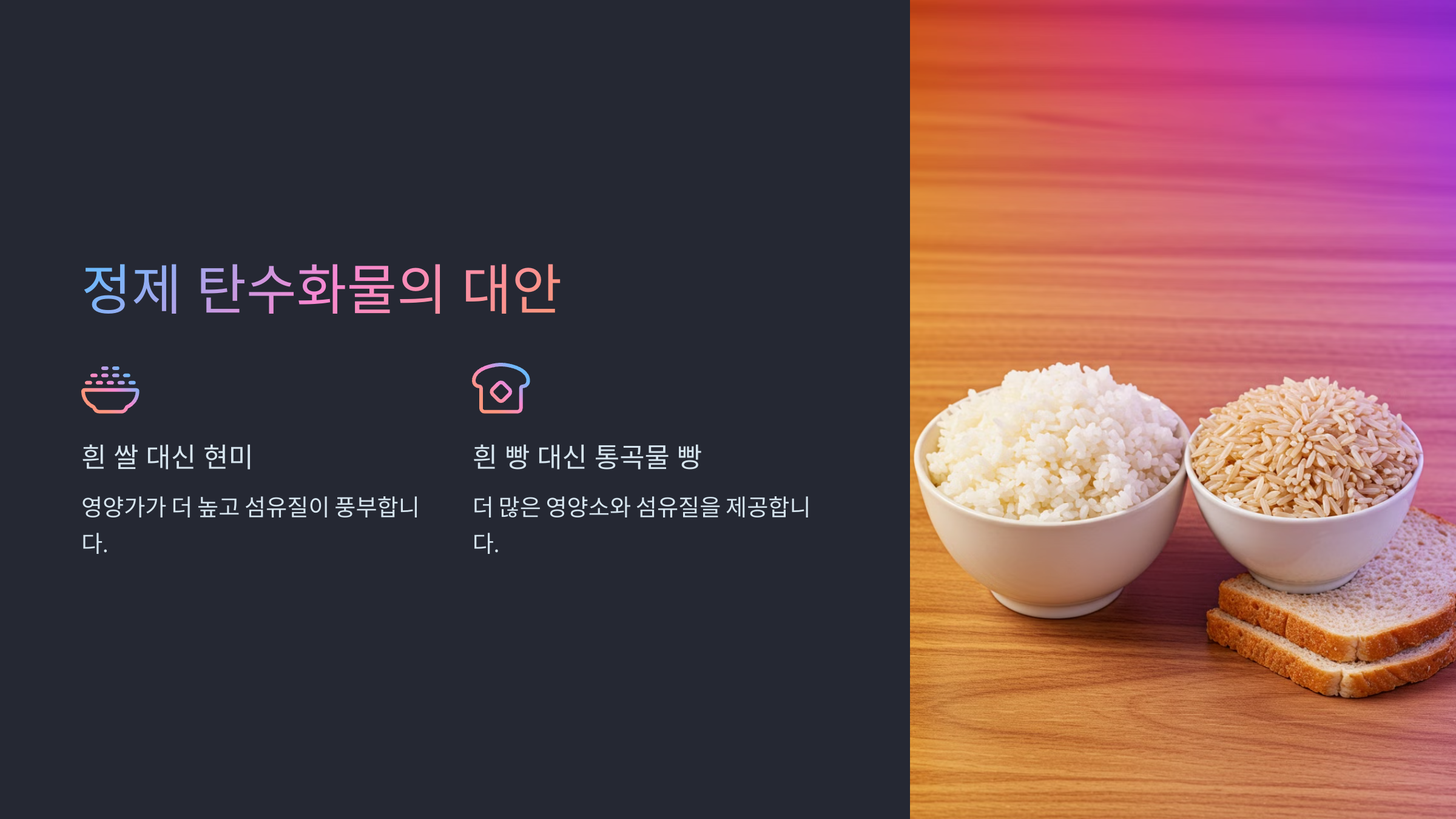 정제 탄수화물을 줄이고 비정제 탄수화물을 섭취하는 것이 좋습니다. 예를 들어, 흰 쌀 대신 현미를 선택하거나, 흰 빵 대신 통곡물 빵을 선택하는 것이 건강에 도움이 됩니다.