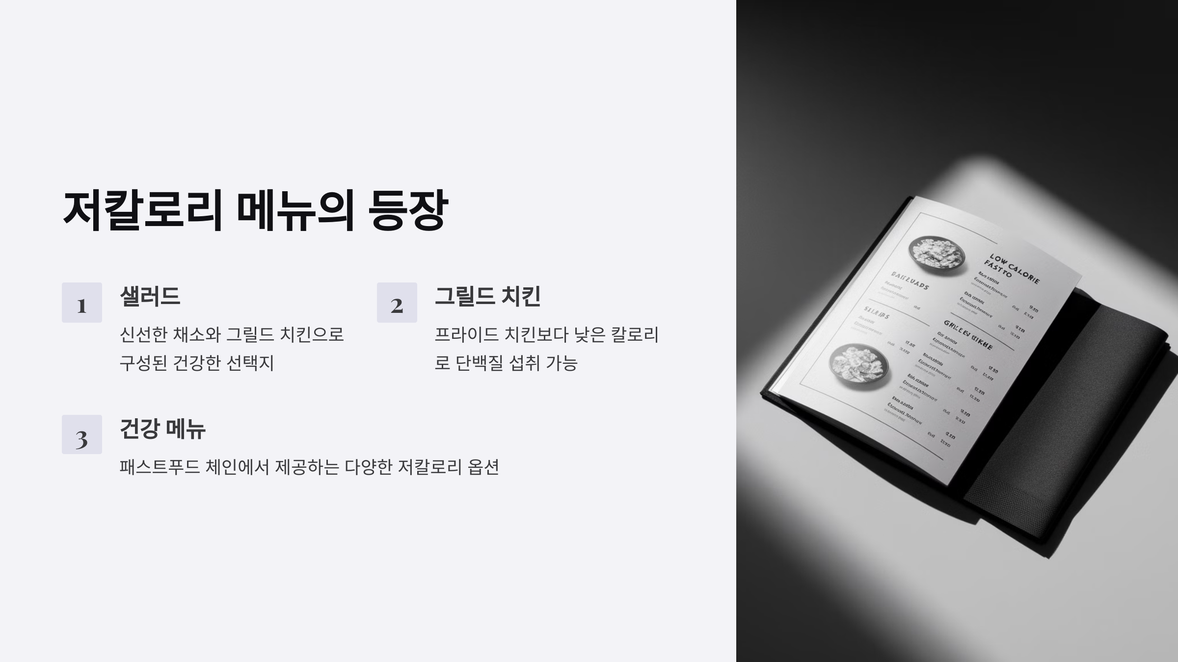 패스트푸드 업계에서도 건강을 고려한 저칼로리 메뉴가 점점 늘어나고 있습니다. 예를 들어, 많은 패스트푸드 체인에서는 샐러드나 그릴드 치킨과 같은 옵션을 제공하고 있습니다. 이러한 메뉴는 일반적인 프라이드치킨이나 햄버거보다 칼로리가 낮아, 건강을 생각하는 소비자들에게 좋은 선택이 될 수 있습니다.