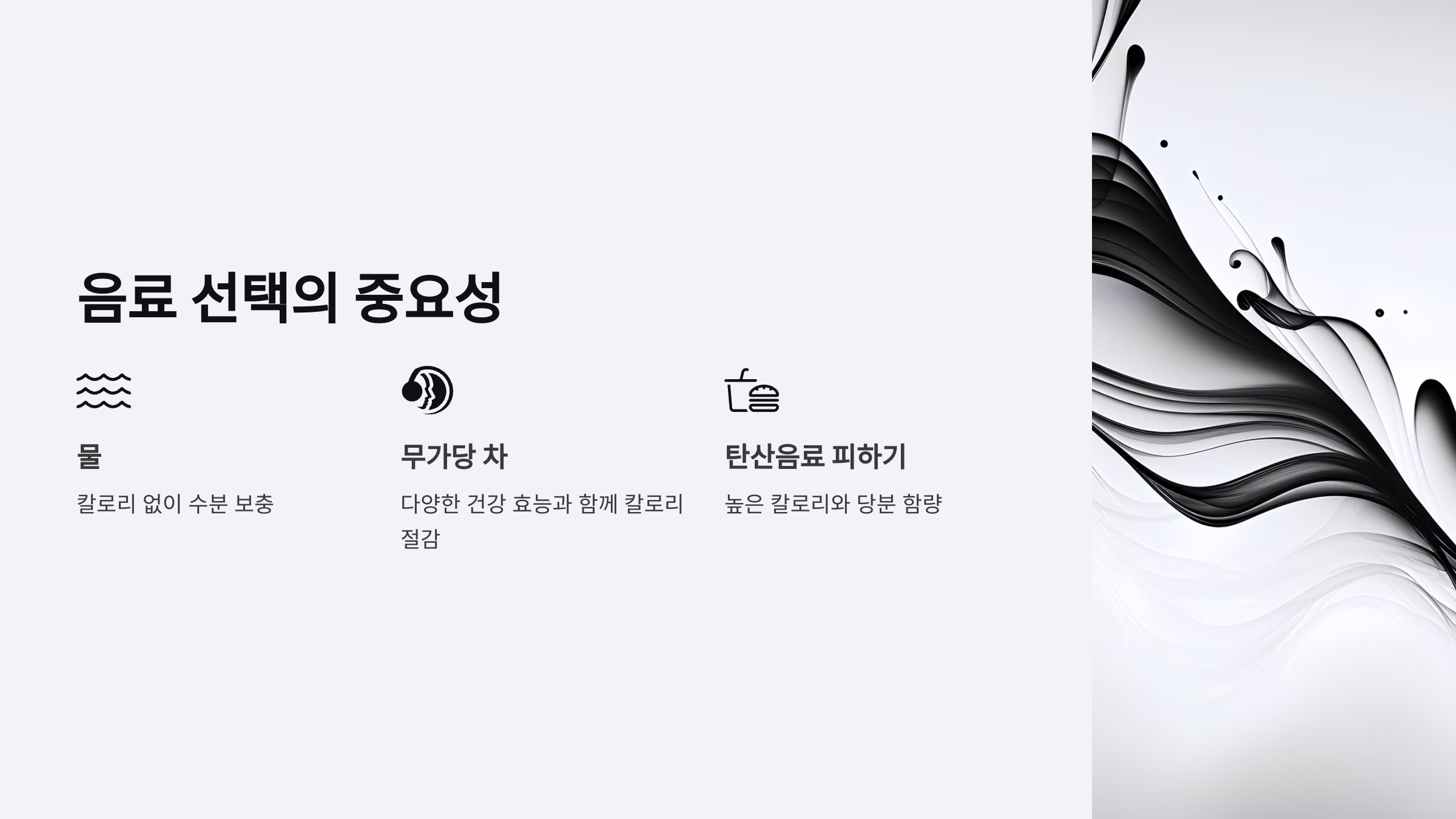 패스트푸드를 먹을 때 음료 선택도 매우 중요합니다. 탄산음료 대신 물이나 무가당 차를 선택하면, 칼로리를 크게 줄일 수 있습니다. 특히, 물은 몸에 수분을 공급해 주고, 무가당 차는 다양한 건강 효능을 가지고 있어 좋은 선택이 될 수 있습니다.