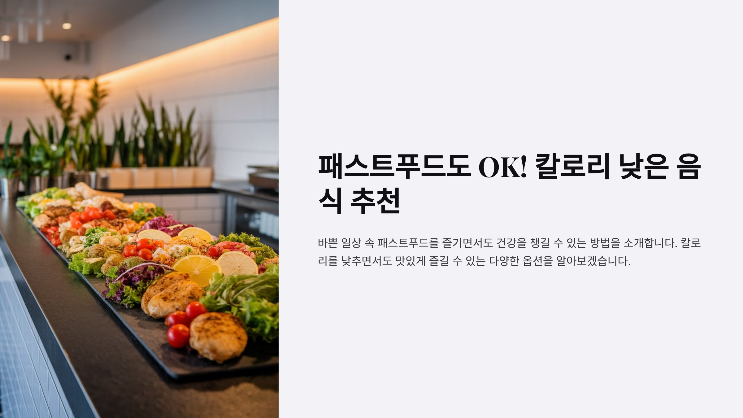 패스트푸드는 빠르고 간편한 식사 옵션으로 많은 사랑을 받고 있지만, 건강을 고려한 선택이 필요합니다. 저칼로리 메뉴, 건강한 사이드, 음료 선택, 조리 방법, 개인 맞춤형 주문 등을 통해 패스트푸드에서도 건강을 챙길 수 있는 방법이 많습니다. 이제는 패스트푸드를 즐기면서도 건강을 잃지 않는 스마트한 소비자가 되어보세요!