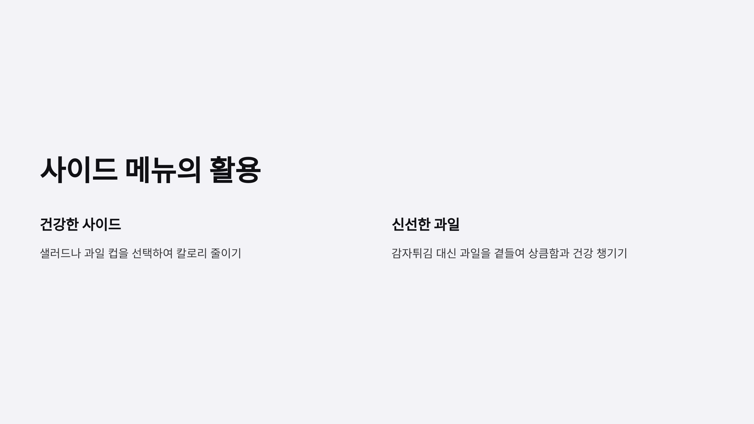 패스트푸드에서 사이드 메뉴는 종종 칼로리를 높이는 주범이 되곤 합니다. 하지만, 샐러드나 과일 컵과 같은 건강한 사이드를 선택하면 칼로리를 줄이면서도 맛있는 식사를 즐길 수 있습니다. 예를 들어, 감자튀김 대신 신선한 과일을 곁들이면, 상큼한 맛과 함께 건강도 챙길 수 있습니다.