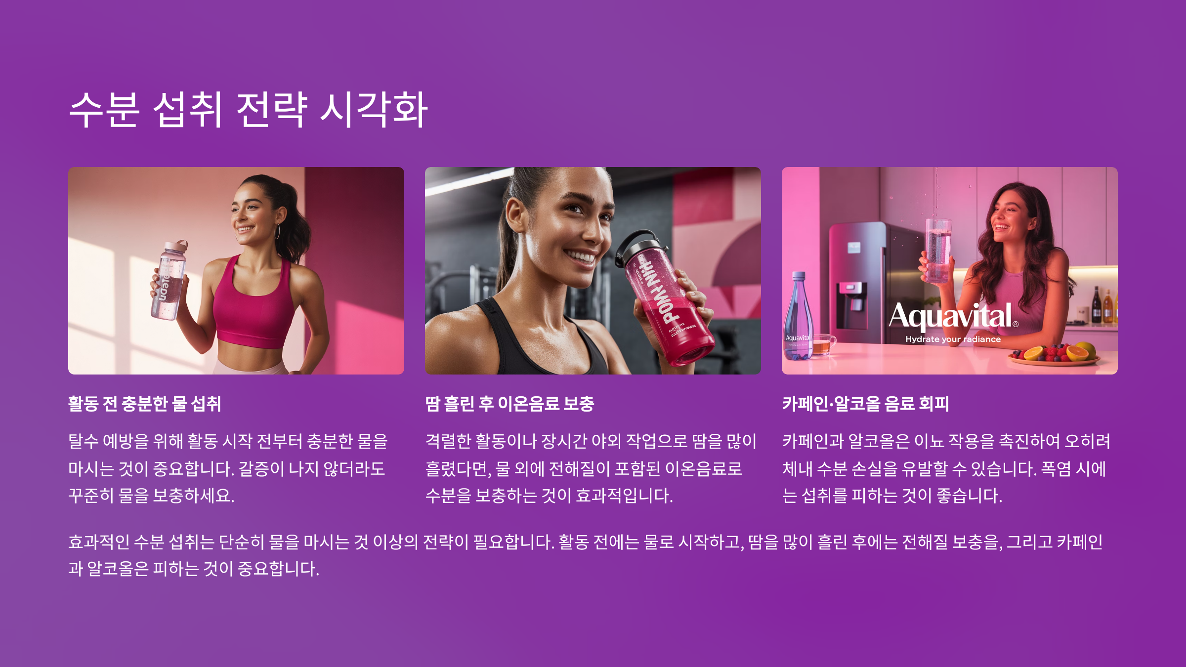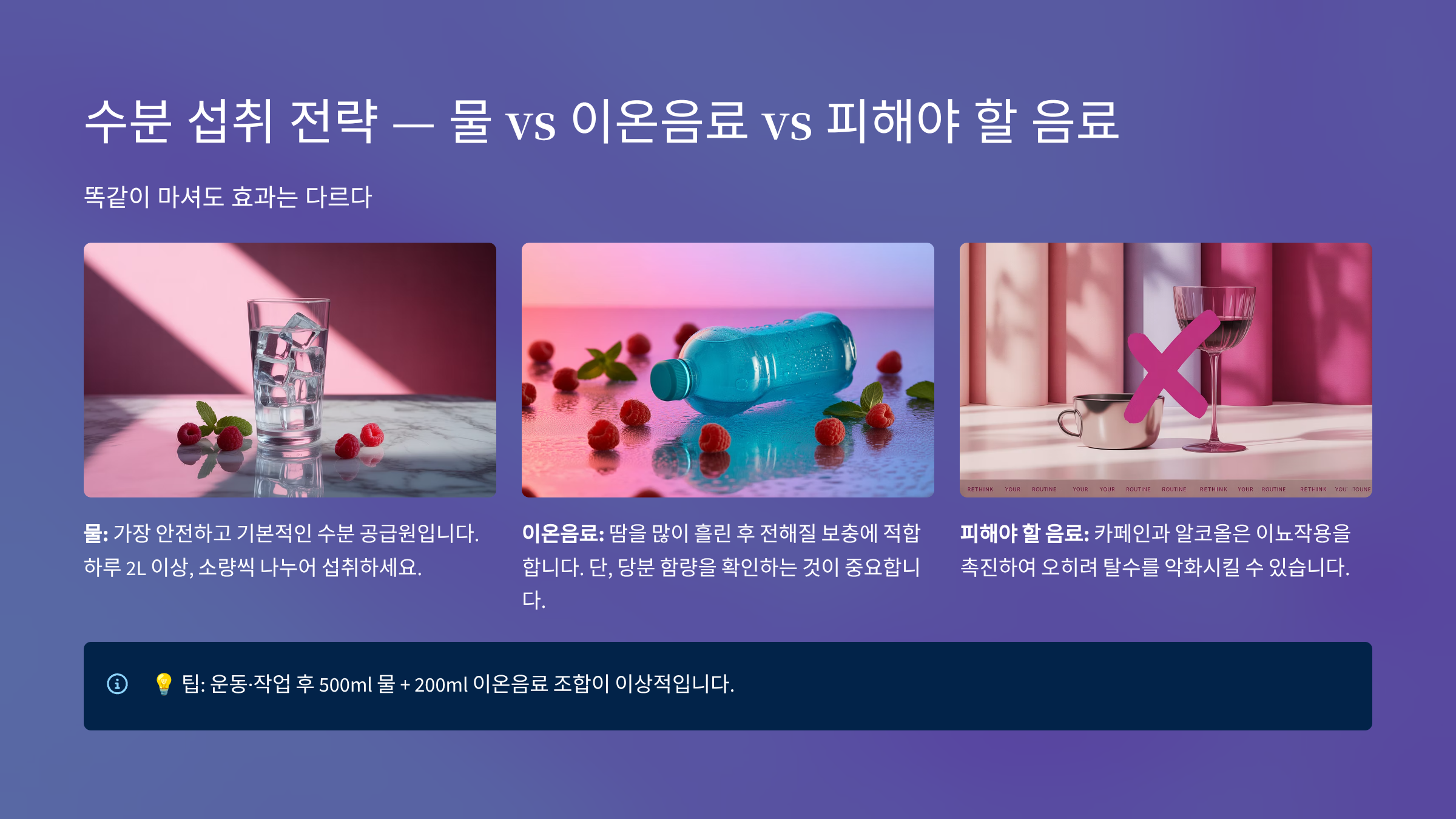 💧 4단계: 수분 섭취 전략 — 물 vs 이온음료 vs 피해야 할 음료
