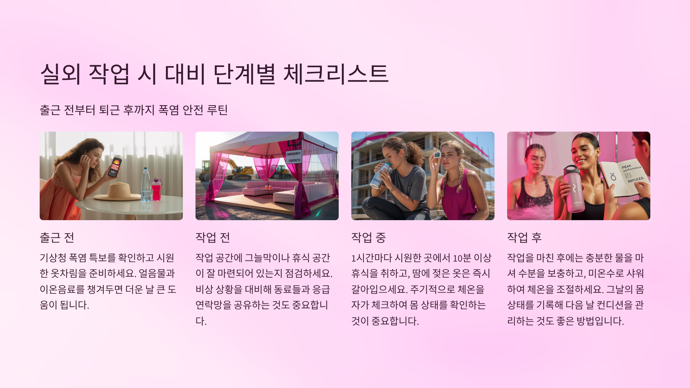 이번 가이드는 ‘물·그늘·휴식’ 3대 기본수칙부터, 실외 작업 체크리스트, 실내 온도 관리, 수분 섭취 전략, 피해야 할 행동까지 모두 담았습니다.